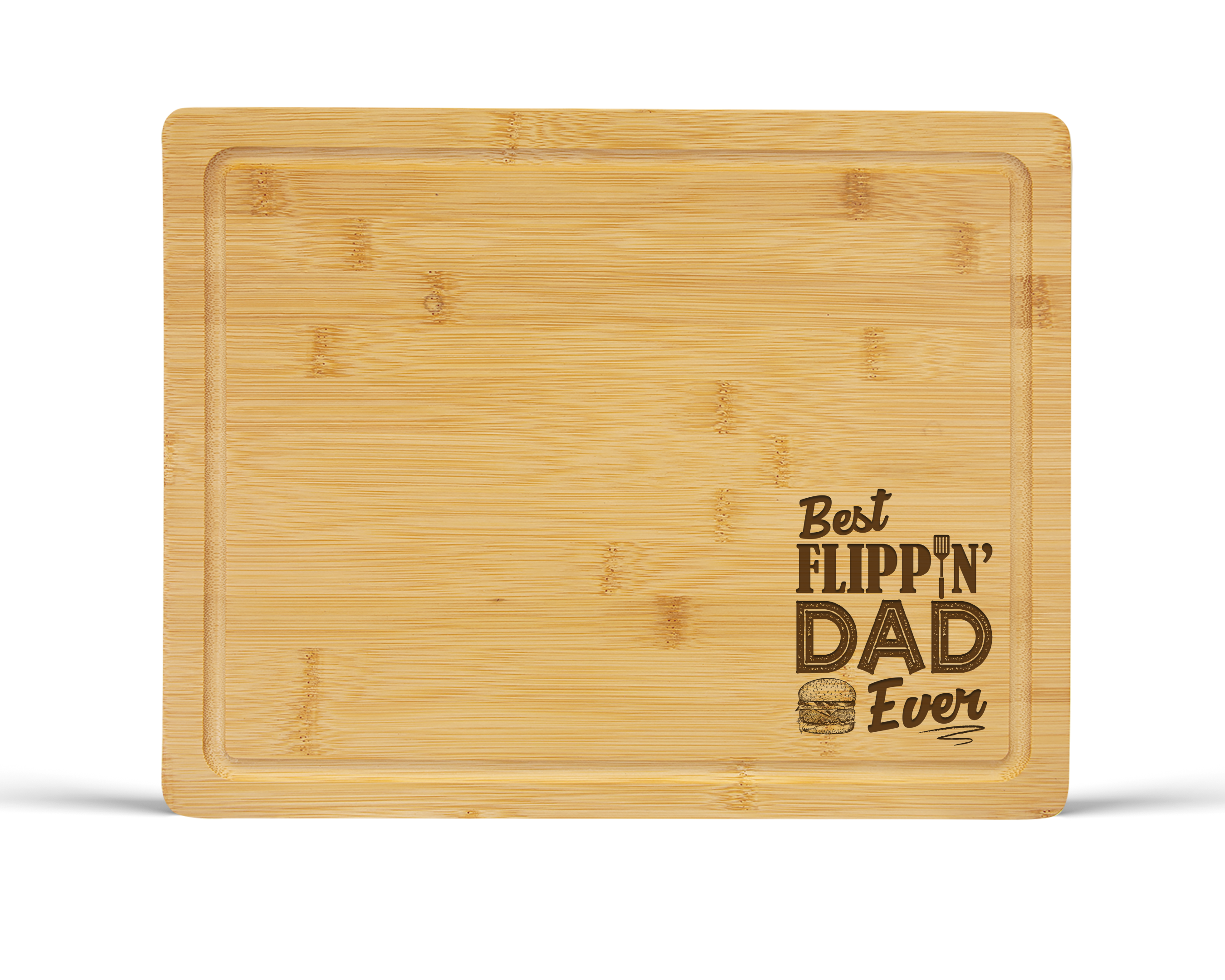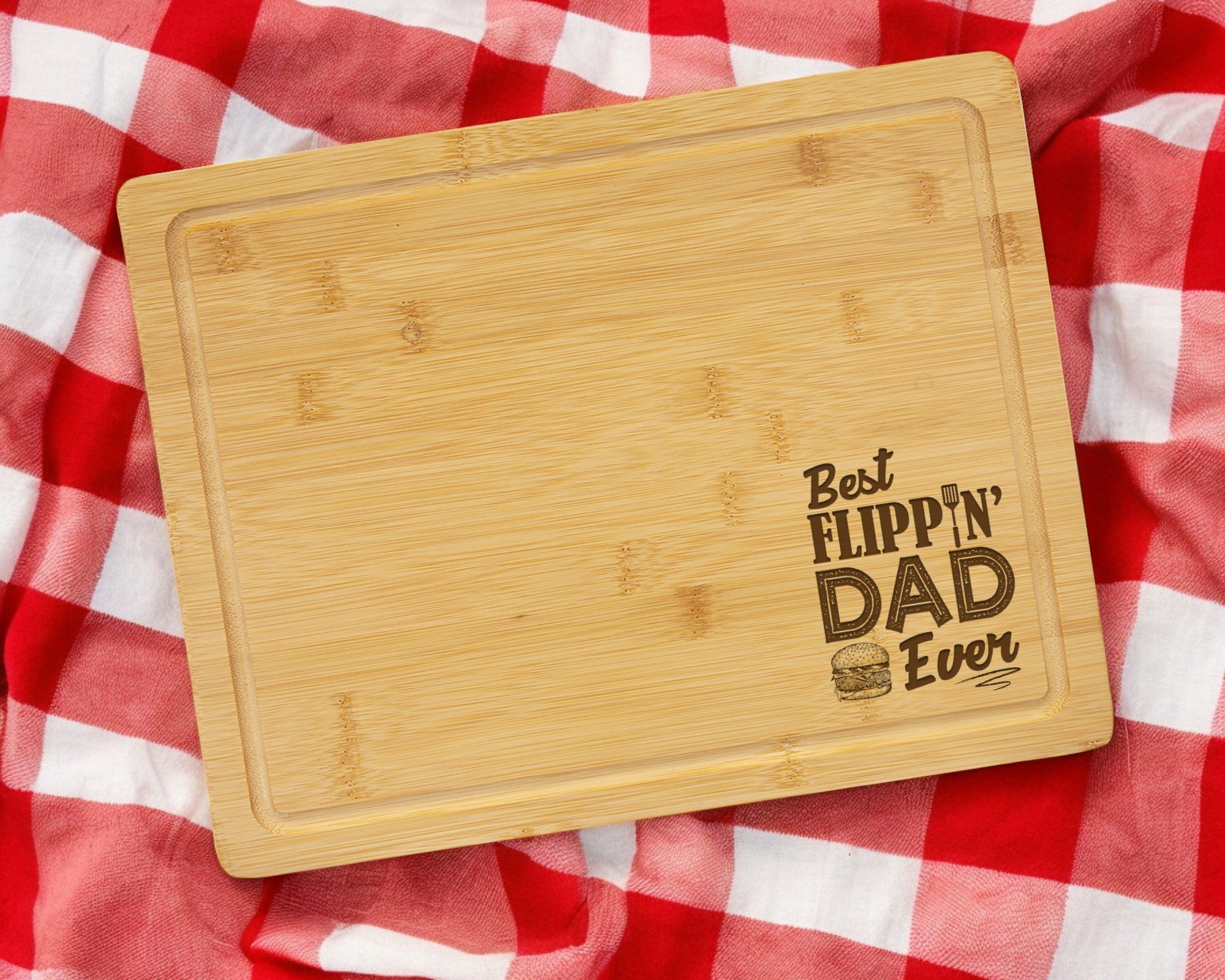 PREMIUM QUALITY AND DESIGN Crafted from 100% sustainable, high-quality natural bamboo, our cutting board is laser engraved with a bold and cheeky "Best Flippin Dad Ever" design. Measuring 13 3/4" x 11" x 1/2", it's ideal for the dad who loves to host and cook.