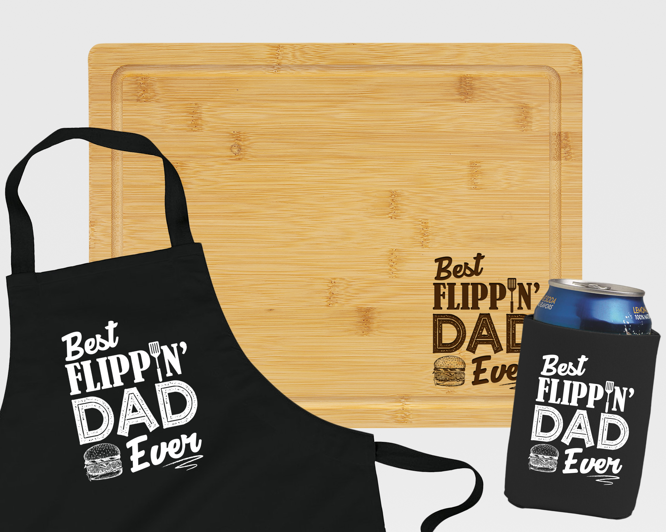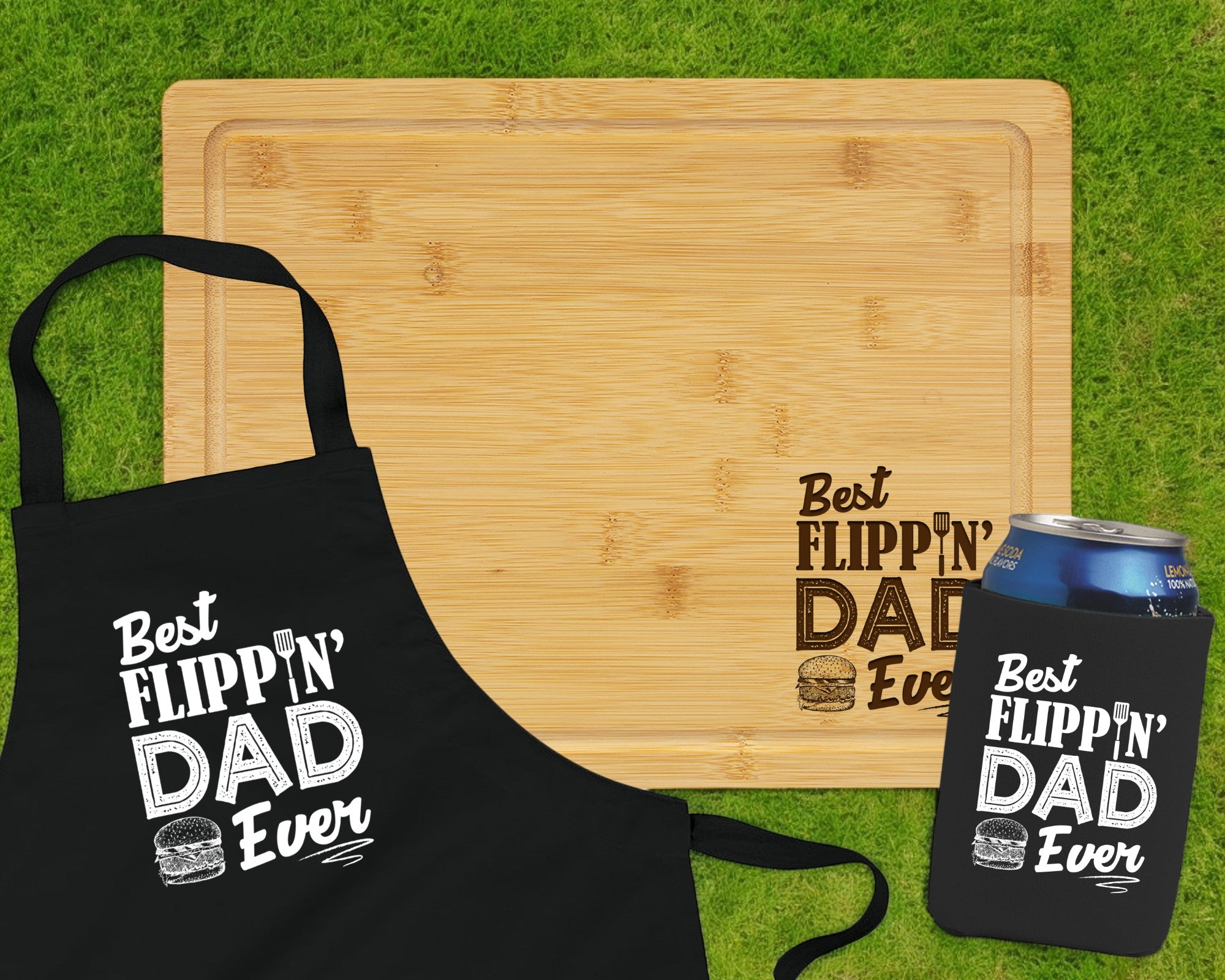 ORDER NOW Add a touch of humor and functionality to your dad's kitchen with our "Best Flippin Dad Ever" bamboo cutting board and grilling set. Order now and give him a gift he'll cherish and use every day!