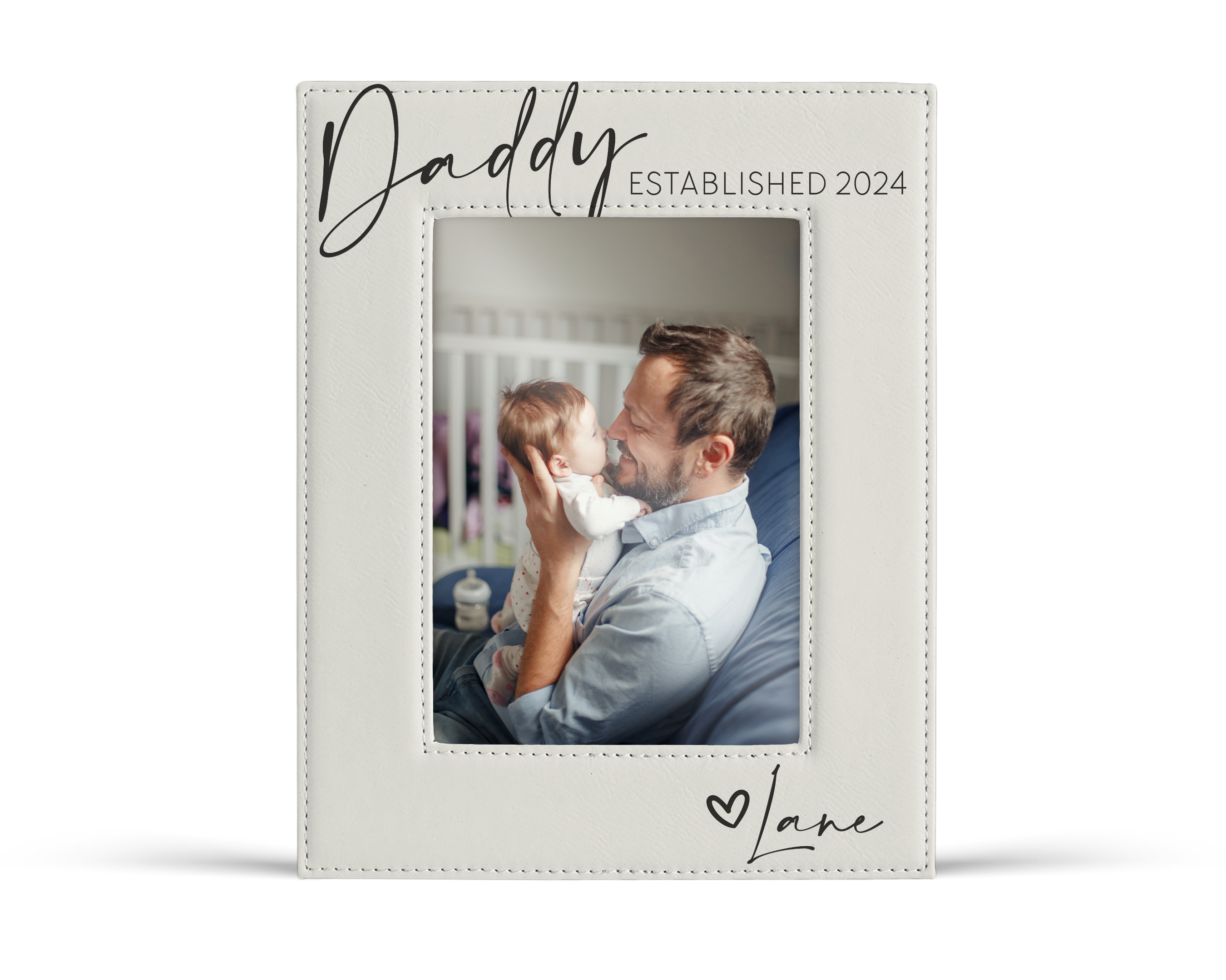 This picture frame celebrates the moment he became a dad. Featuring a smooth white leatherette finish and engraved with “Daddy Est.” and the year, it’s a meaningful way to mark the start of his fatherhood journey.