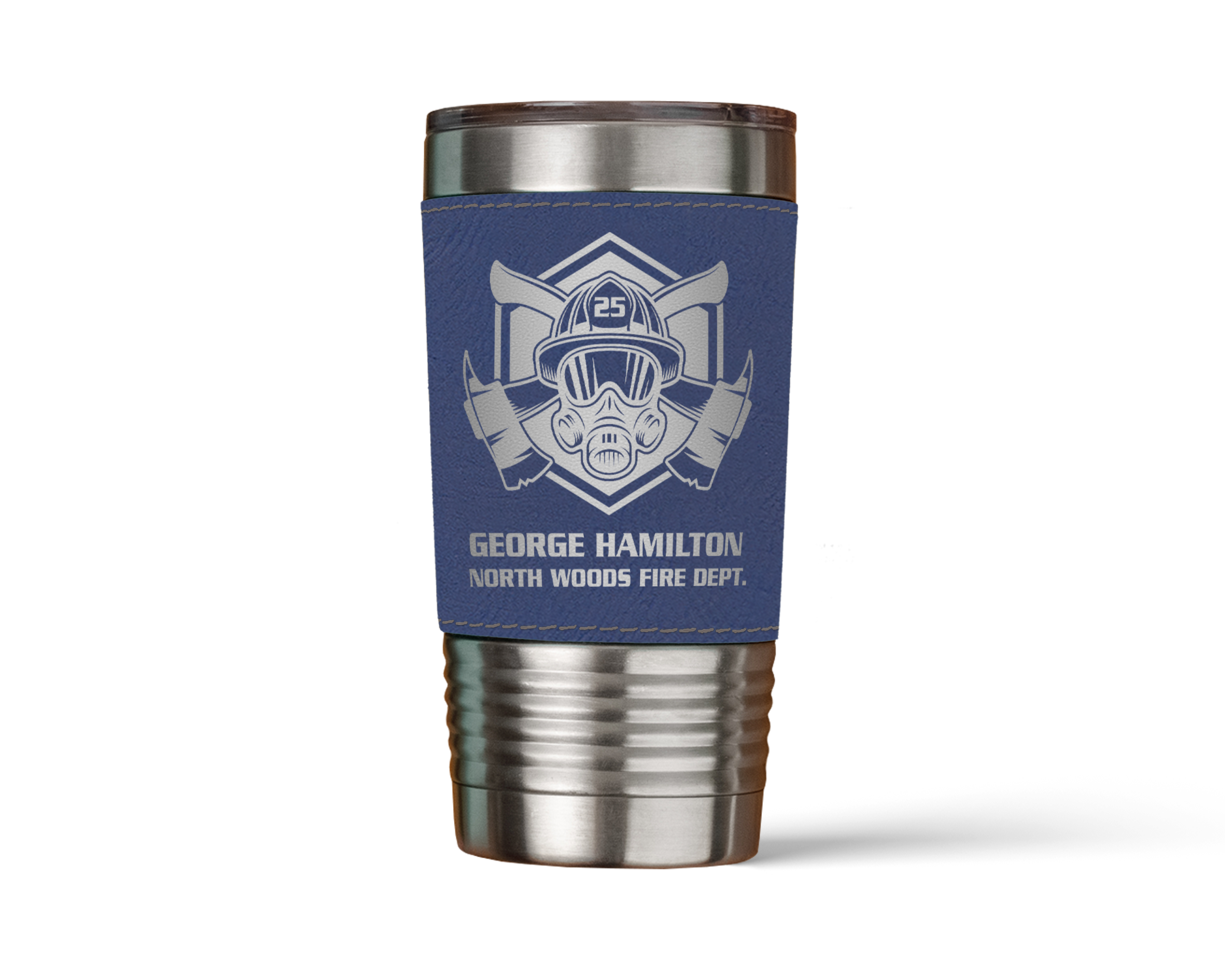 Fireman Helmet and Axe Personalized Tumbler with Leather Sleeve