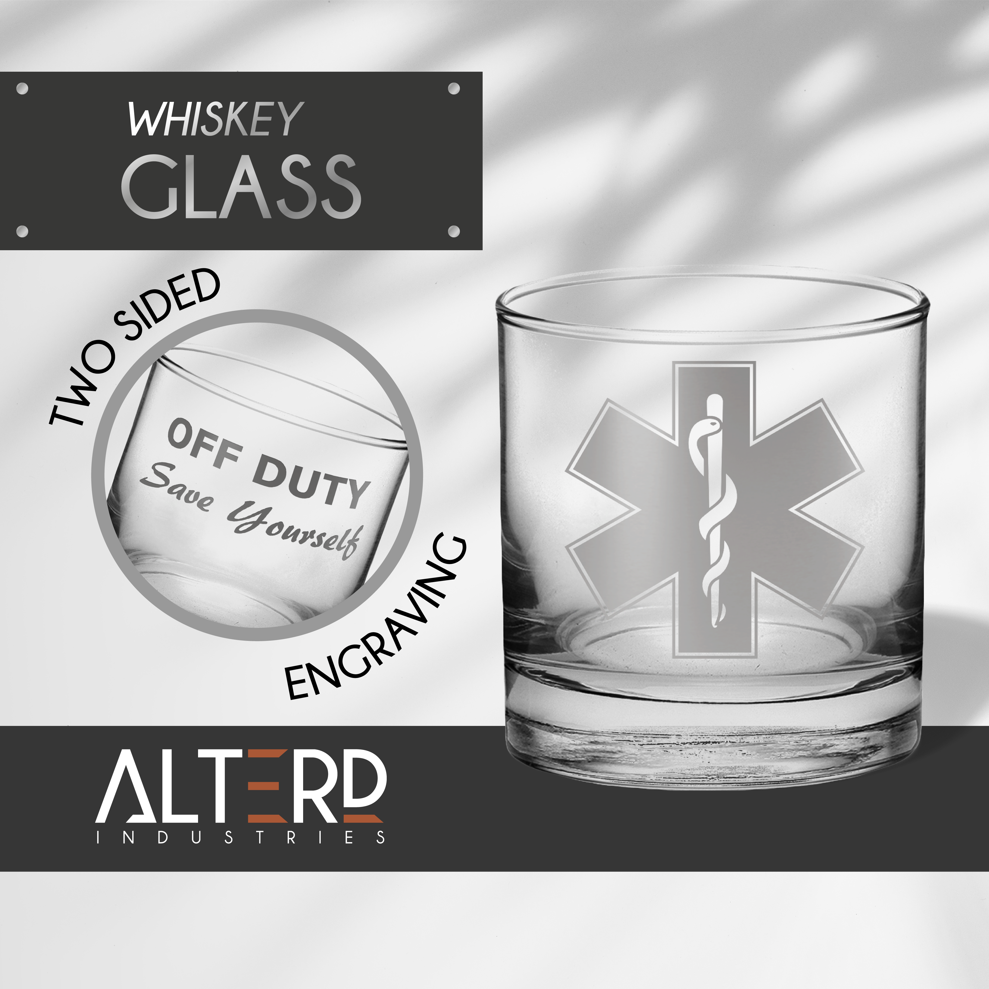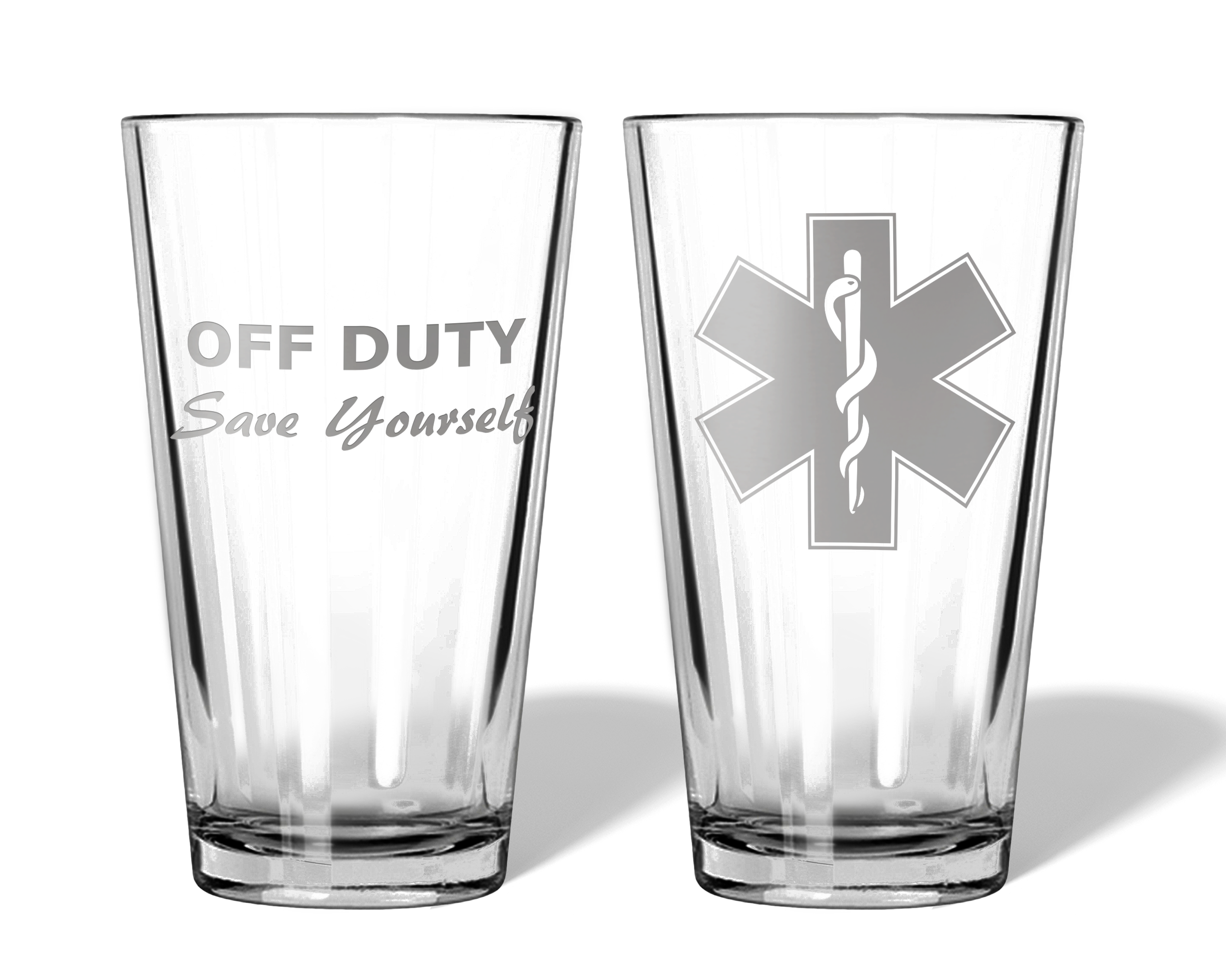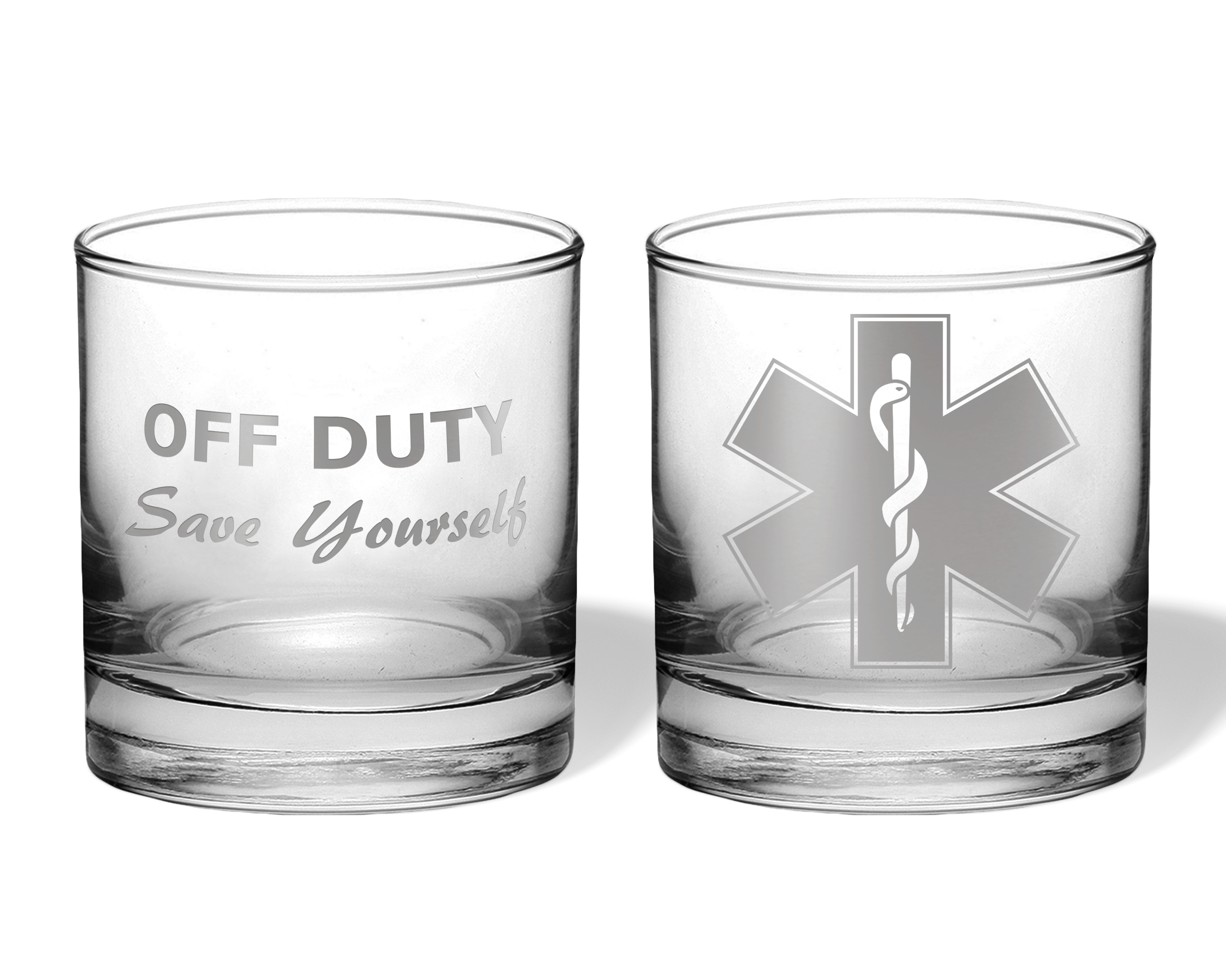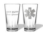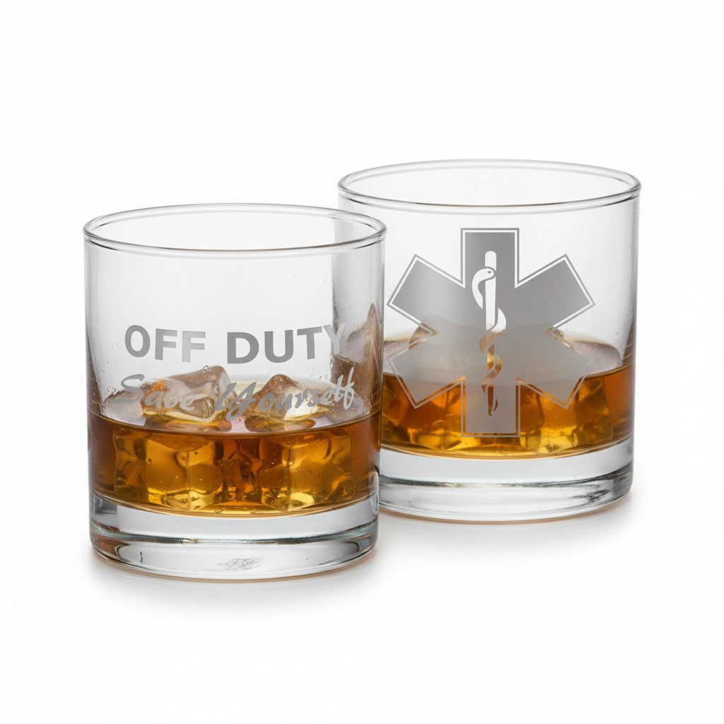 Our Off Duty EMT & Paramedic Engraved Glasses are designed to celebrate the lighter side of life after the shift ends. Featuring the iconic Medical Star of Life engraved on the front and the phrase “Off Duty, Save Yourself” on the back, these glasses add a playful, well-earned nod to the dedication of first responders.