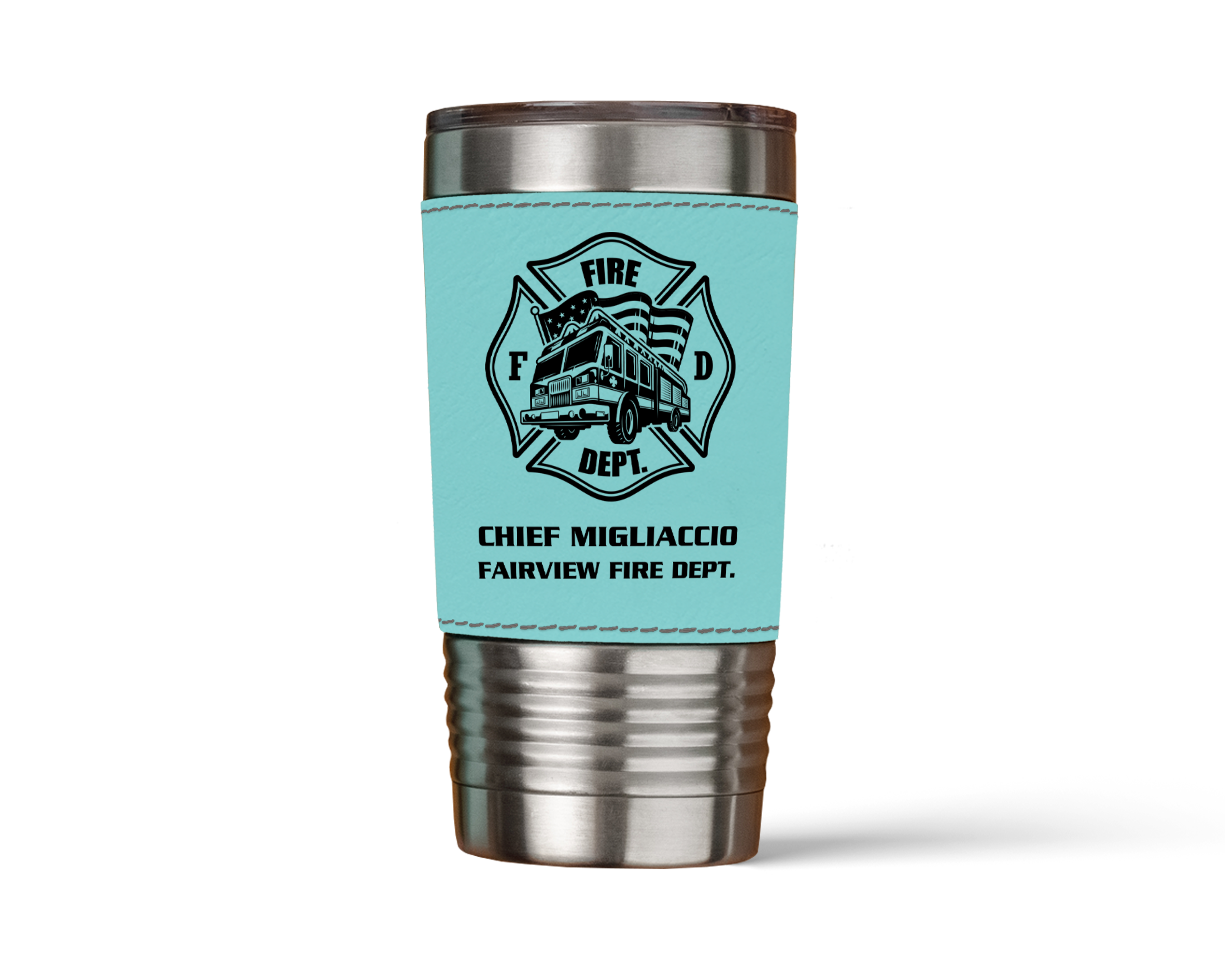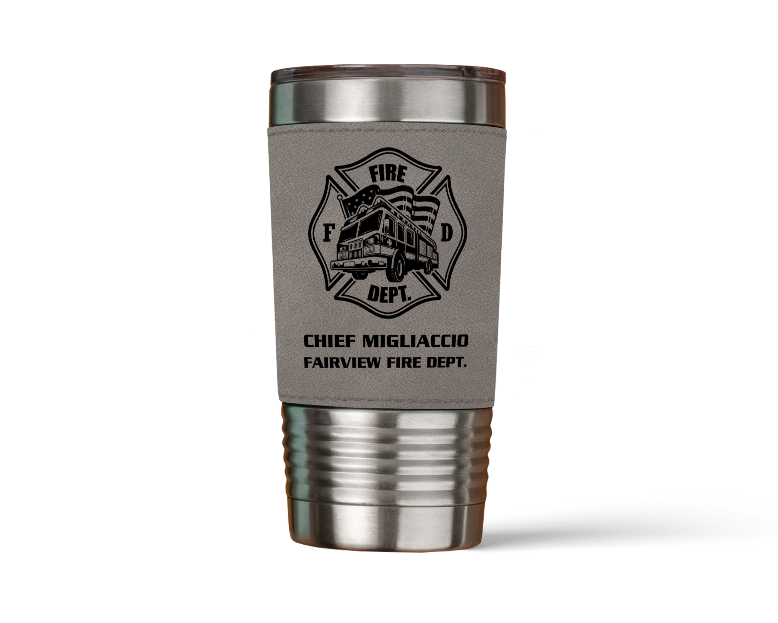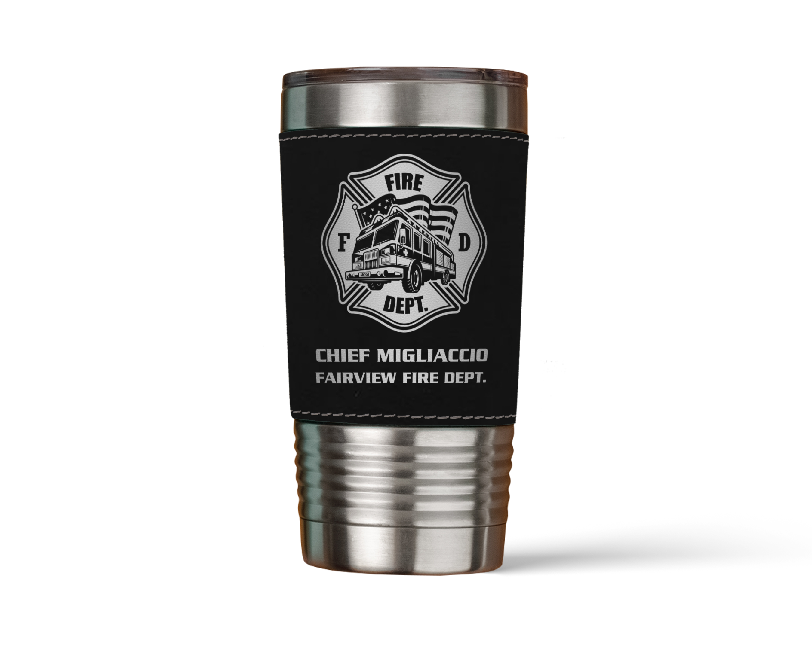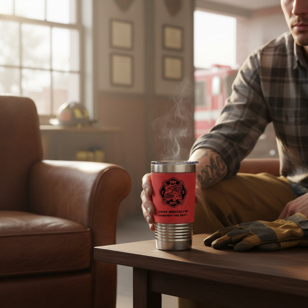 Designed for firefighters on the go, the Personalized Maltese Cross Firefighter Tumbler combines rugged performance with a polished, duty-ready look. Wrapped in a durable vegan leather sleeve and permanently engraved with name, rank, and department details, this tumbler keeps drinks at the perfect temperature while showing pride in service—on shift or off.