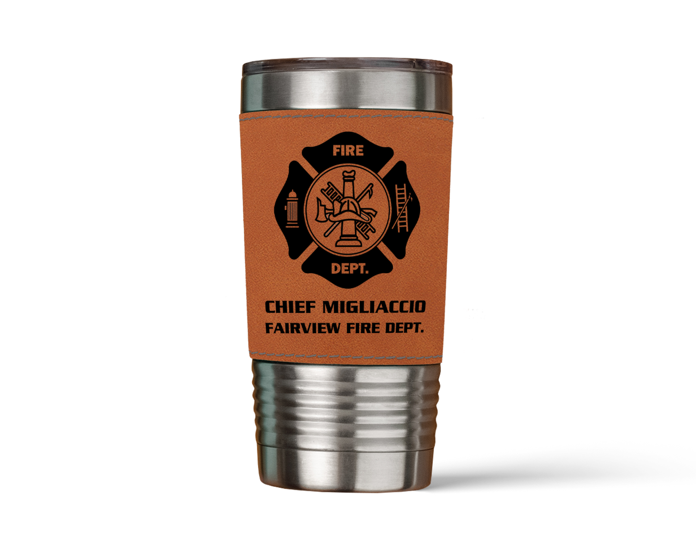 Maltese Cross Personalized Firefighter Tumbler with Leather Sleeve
