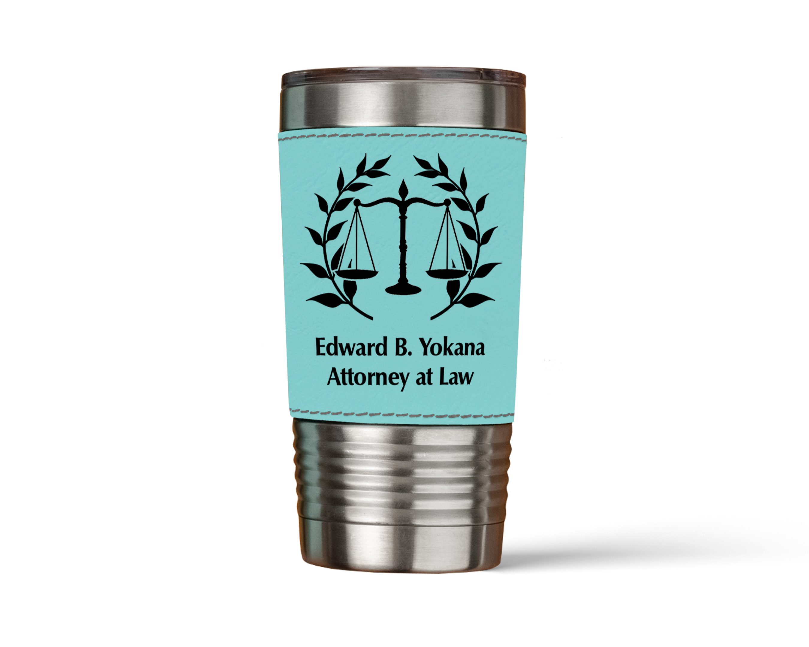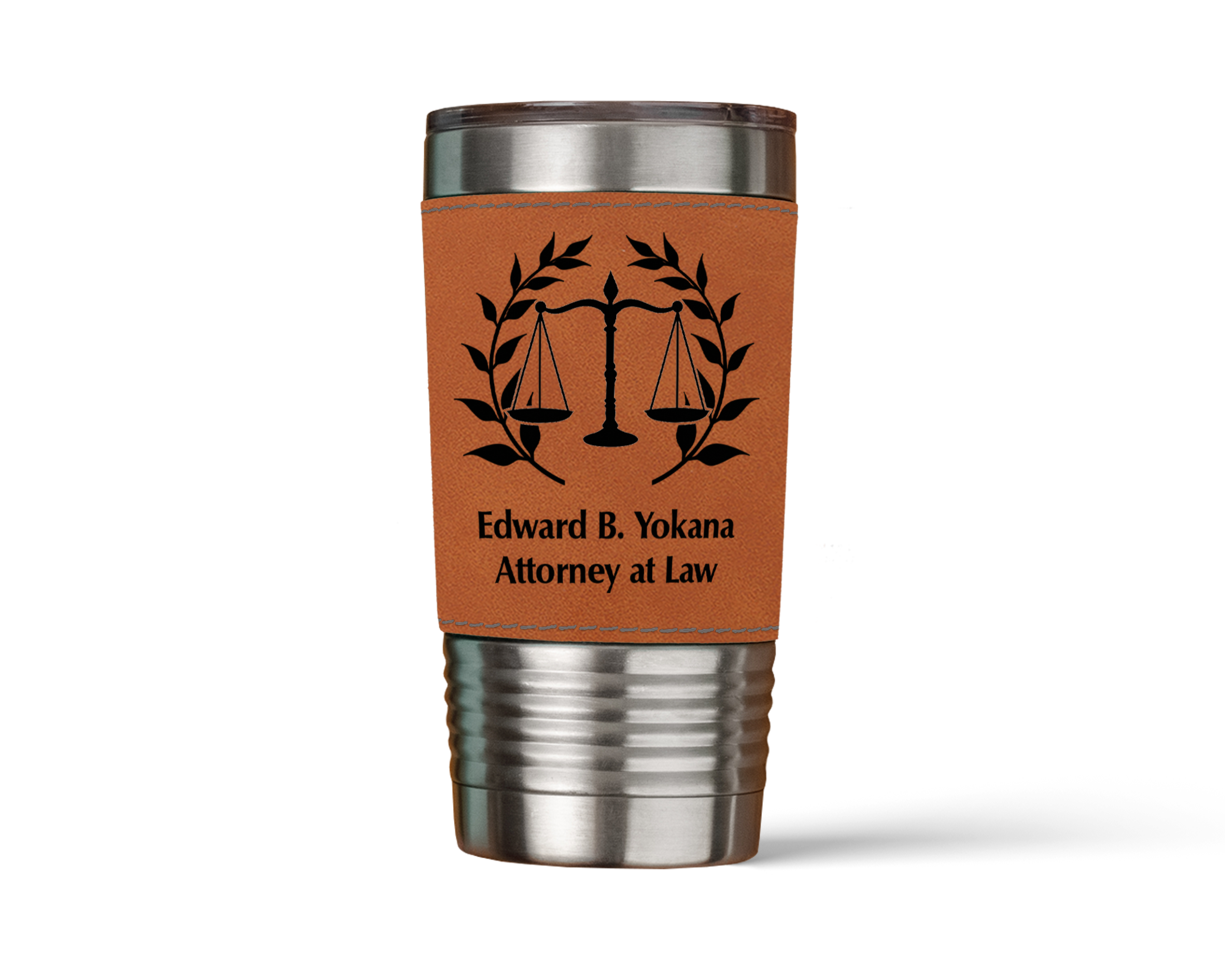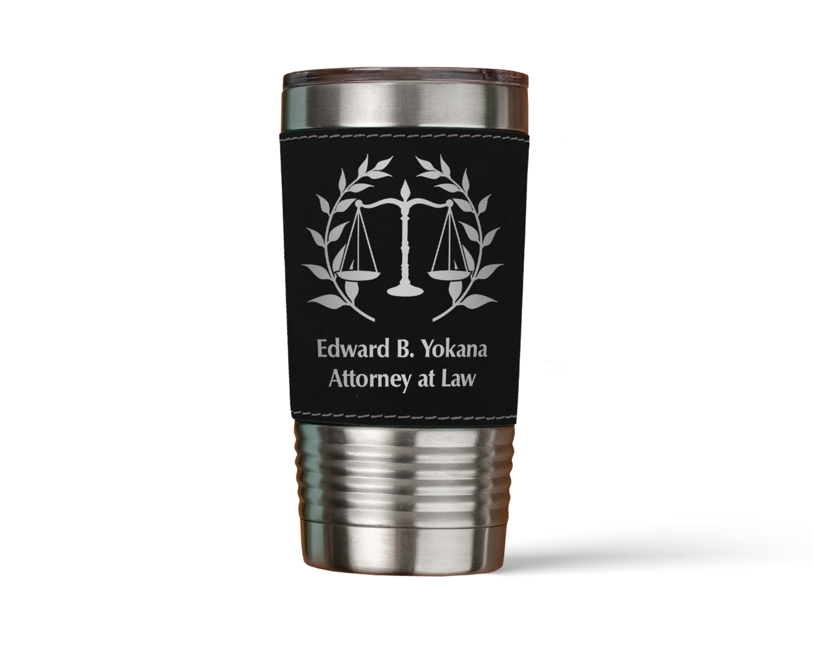 Whether you're heading to the office, the courtroom, or simply embarking on a day of meetings, this personalized leatherette tumbler is the ideal companion. It not only keeps your favorite beverages at the perfect temperature but also showcases your professional identity and style with grace and distinction.
