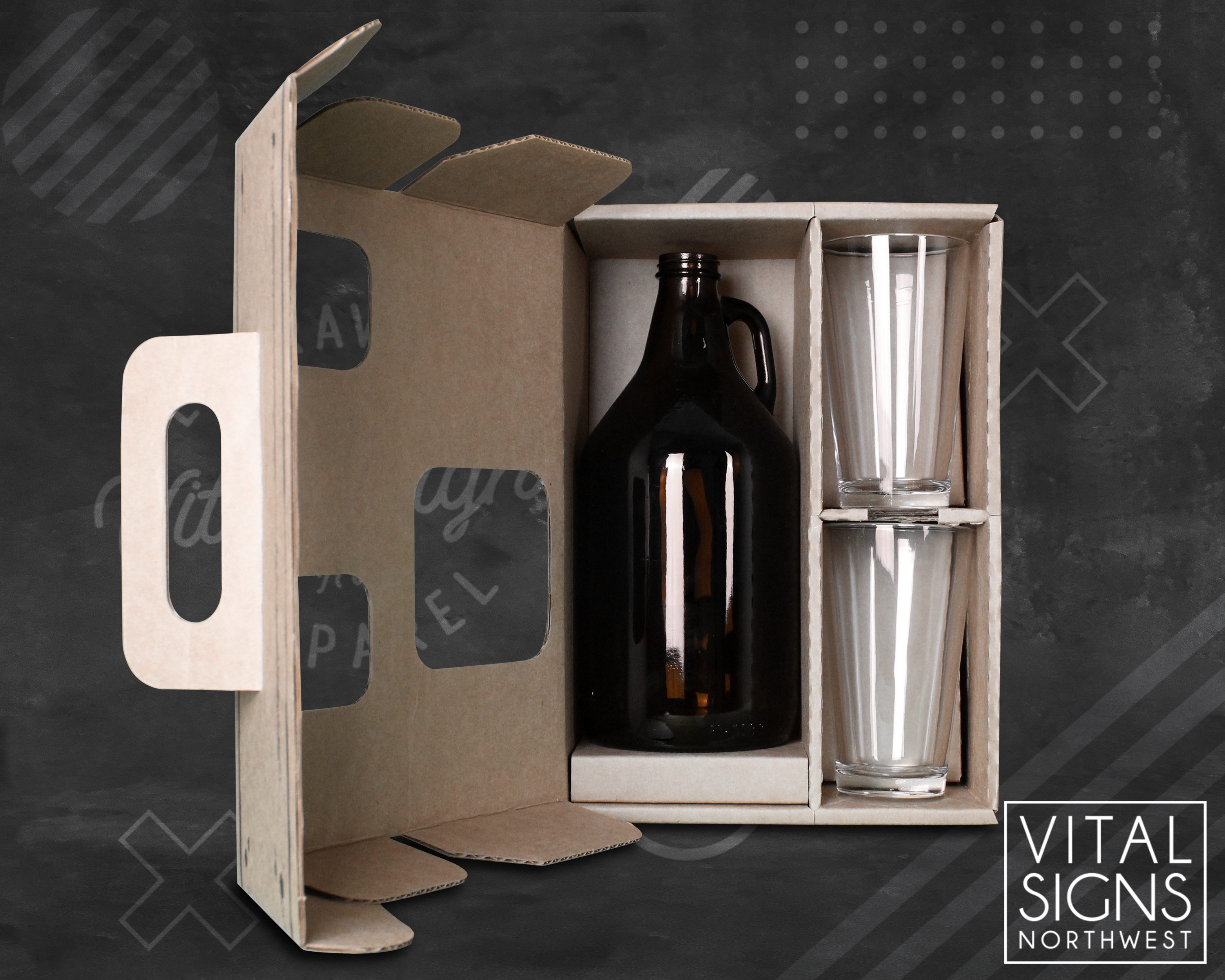 All our glassware, including the pint glasses and growler, is dishwasher safe, ensuring effortless cleaning and convenience for the recipient. Each gift option is packaged in a window display box, allowing the recipient to view the engraved craftsmanship before even opening the box. As a special touch, we include a complimentary coaster for each glass, adding an extra element of practicality and thoughtfulness.