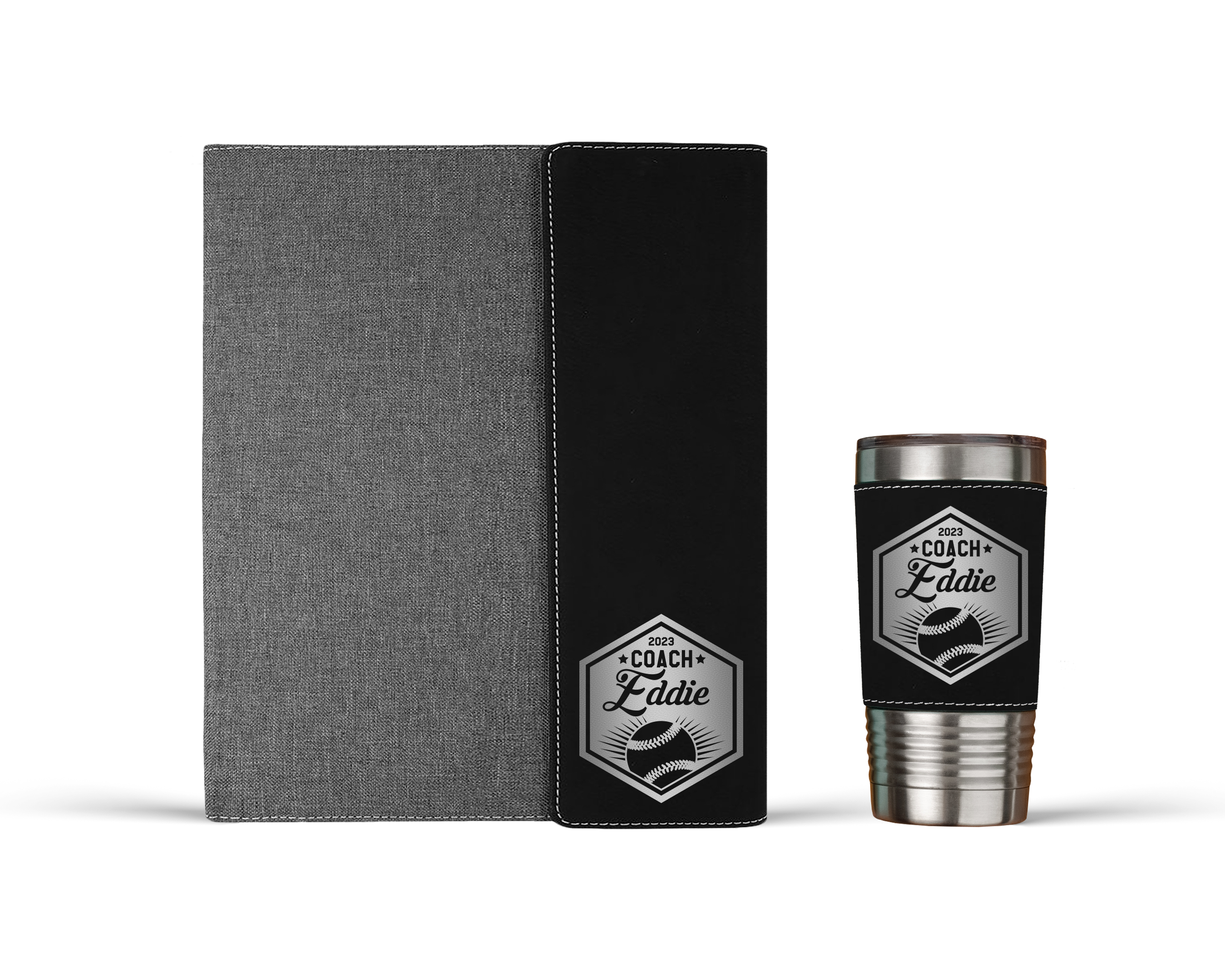 THE ULTIMATE GIFT SET Complementing the portfolio is a 20 oz tumbler wrapped in leatherette. This vacuum-insulated tumbler keeps beverages hot or cold throughout the day. Engraved to match the portfolio, it’s the perfect accessory for a coach’s hectic schedule. This set combines functionality with style, making it an essential companion for practices, meetings, and game days.
