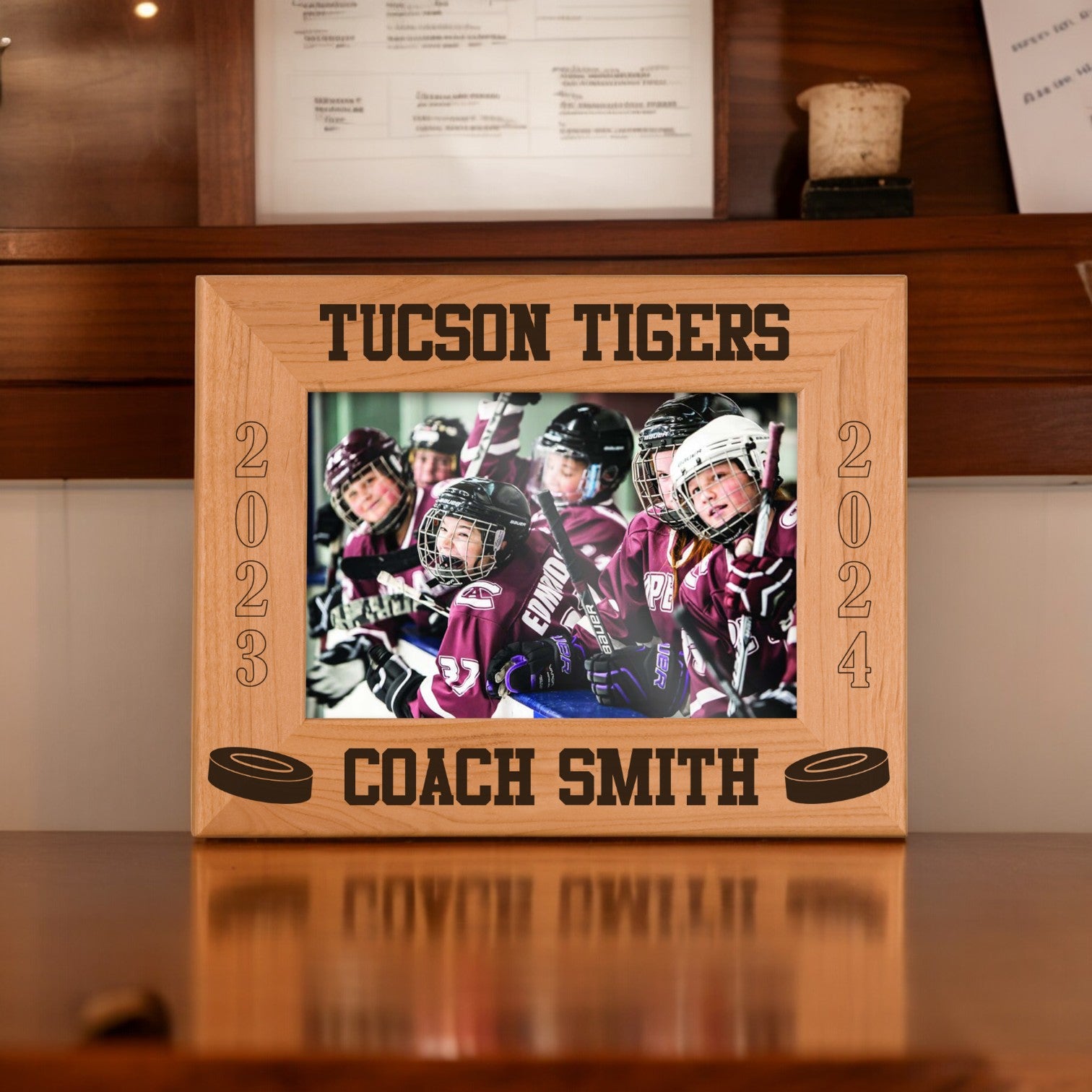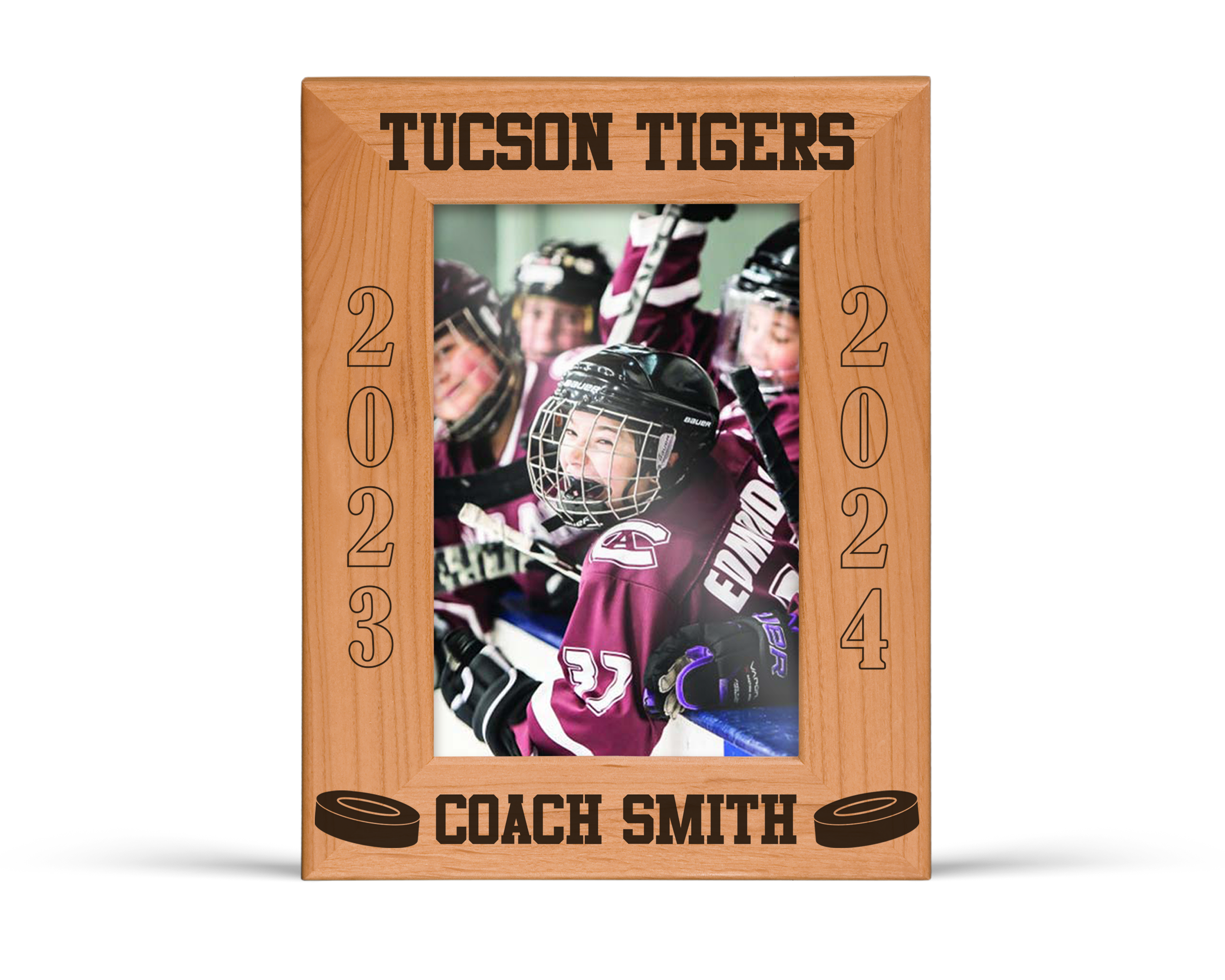 Designed to showcase your favorite team or season photo, it becomes a lasting keepsake they’ll proudly display at home, in the office, or in the rink. The rich wood grain and engraved details create a clean, classic look that reflects the dedication, discipline, and teamwork behind every great hockey season.