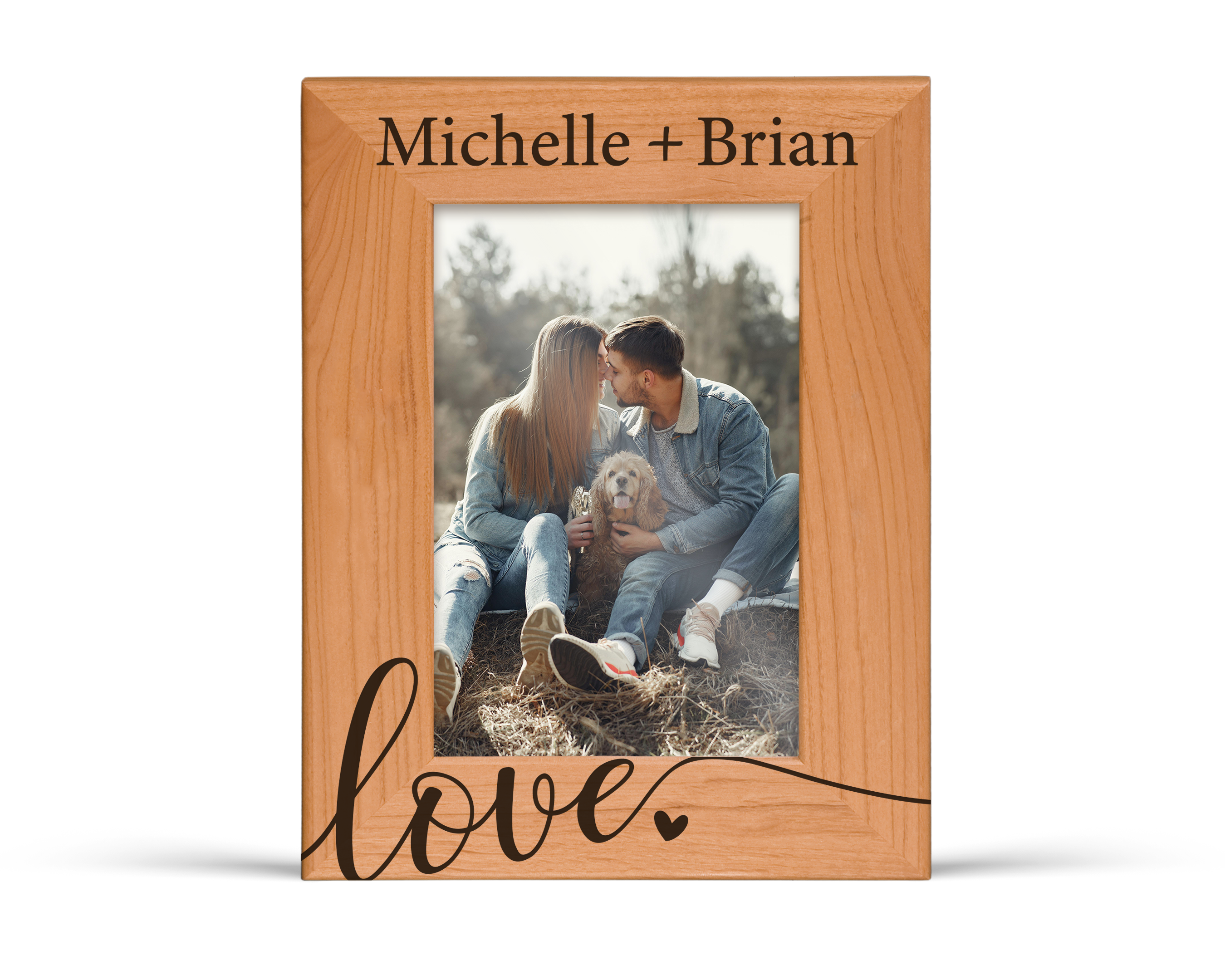 This personalized wood picture frame celebrates love at every stage. Engraved with a flowing “love” design in the lower corner and finished with the couple’s names across the top, it’s a timeless way to showcase a favorite photo.