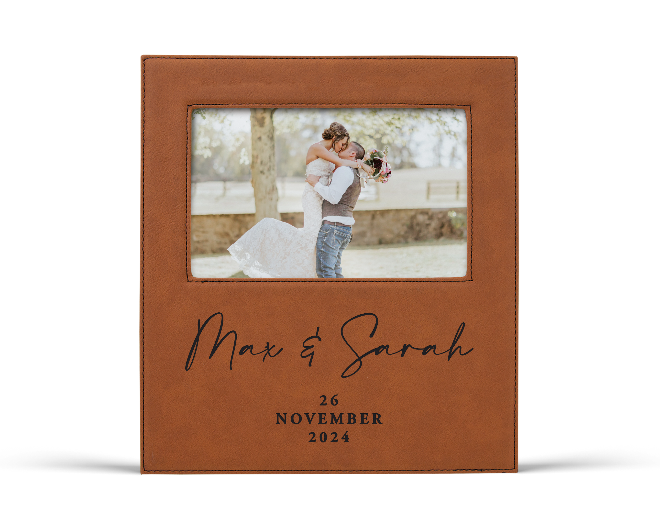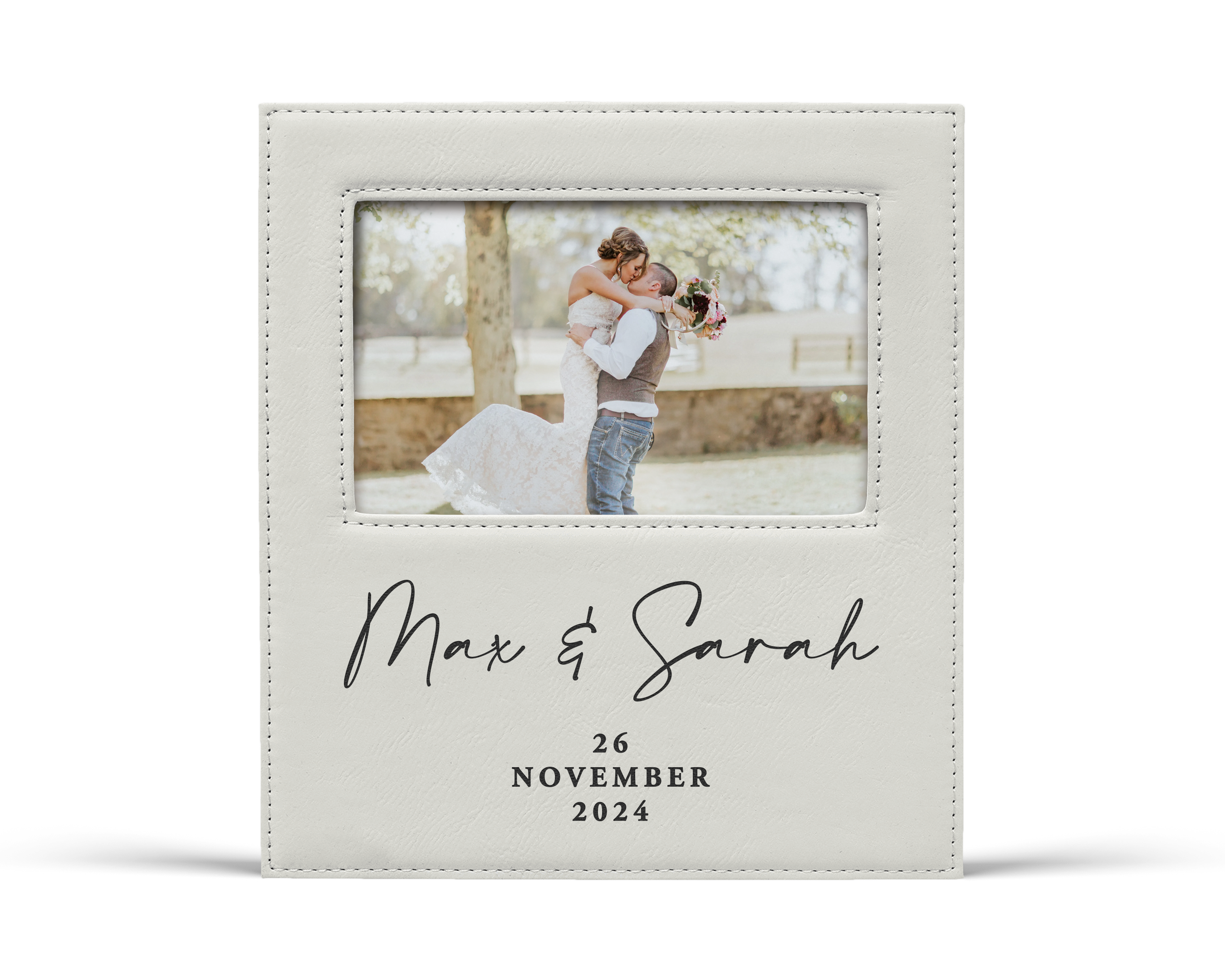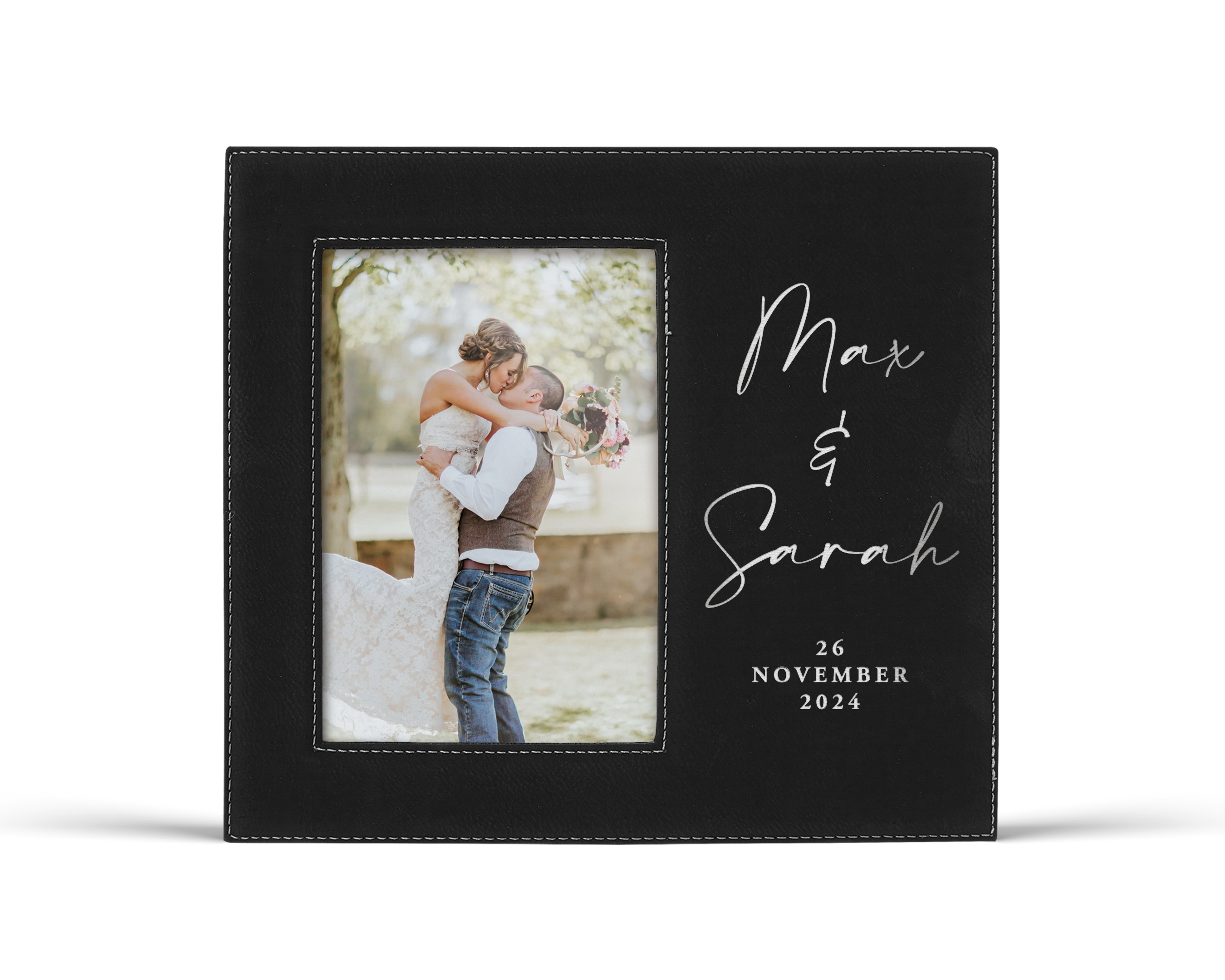 This personalized minimalist script leatherette picture frame is a modern and romantic way to celebrate your love story. Customized with the couple’s first names in an elegant script and a meaningful date, it’s designed to mark the moment that matters most.