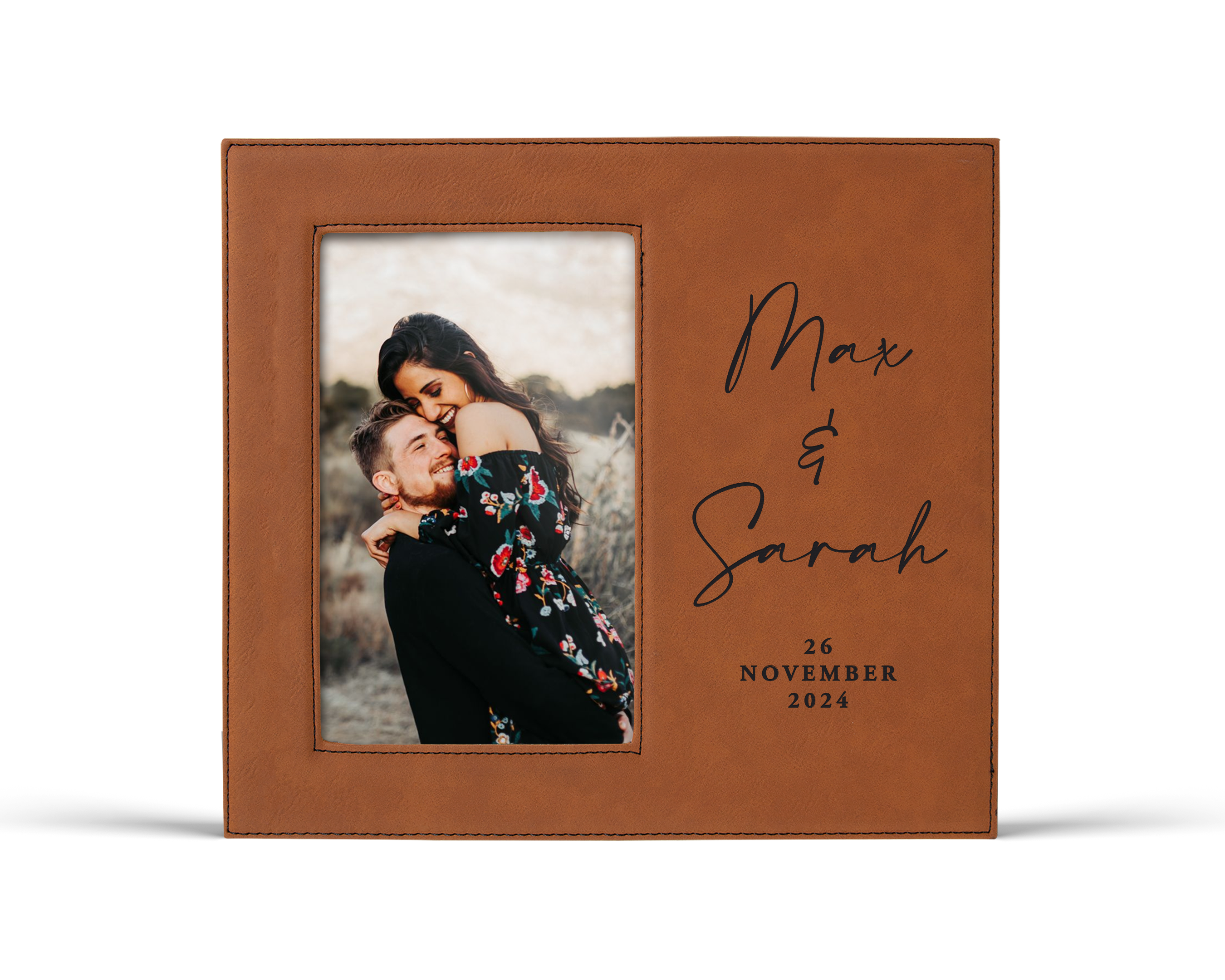Finished in smooth leatherette with a permanently engraved design, this frame is made to hold a favorite photo and be displayed proudly in your home. A thoughtful keepsake for engaged couples, newlyweds, or partners celebrating an anniversary, Valentine’s Day, or the day everything changed.