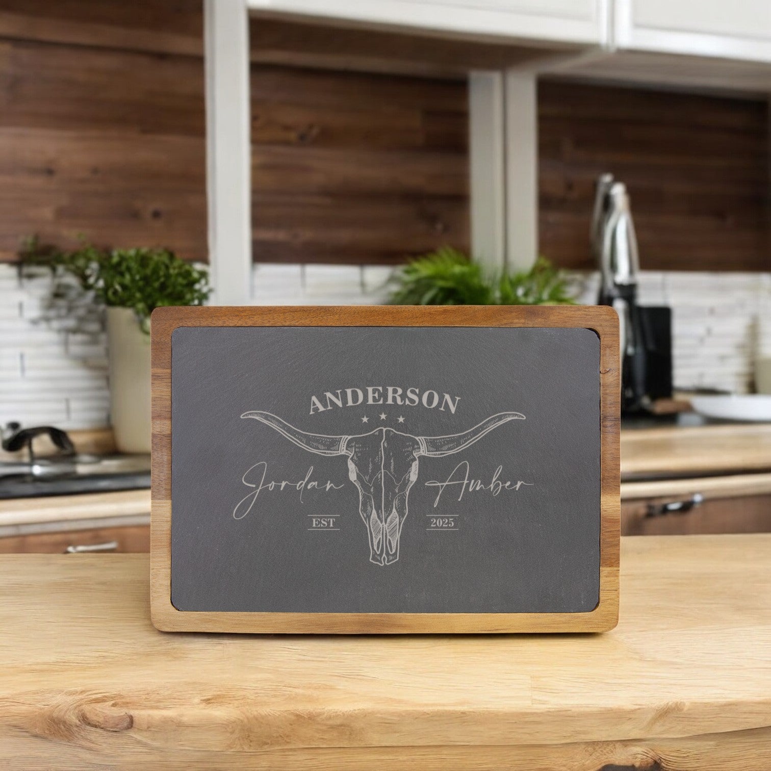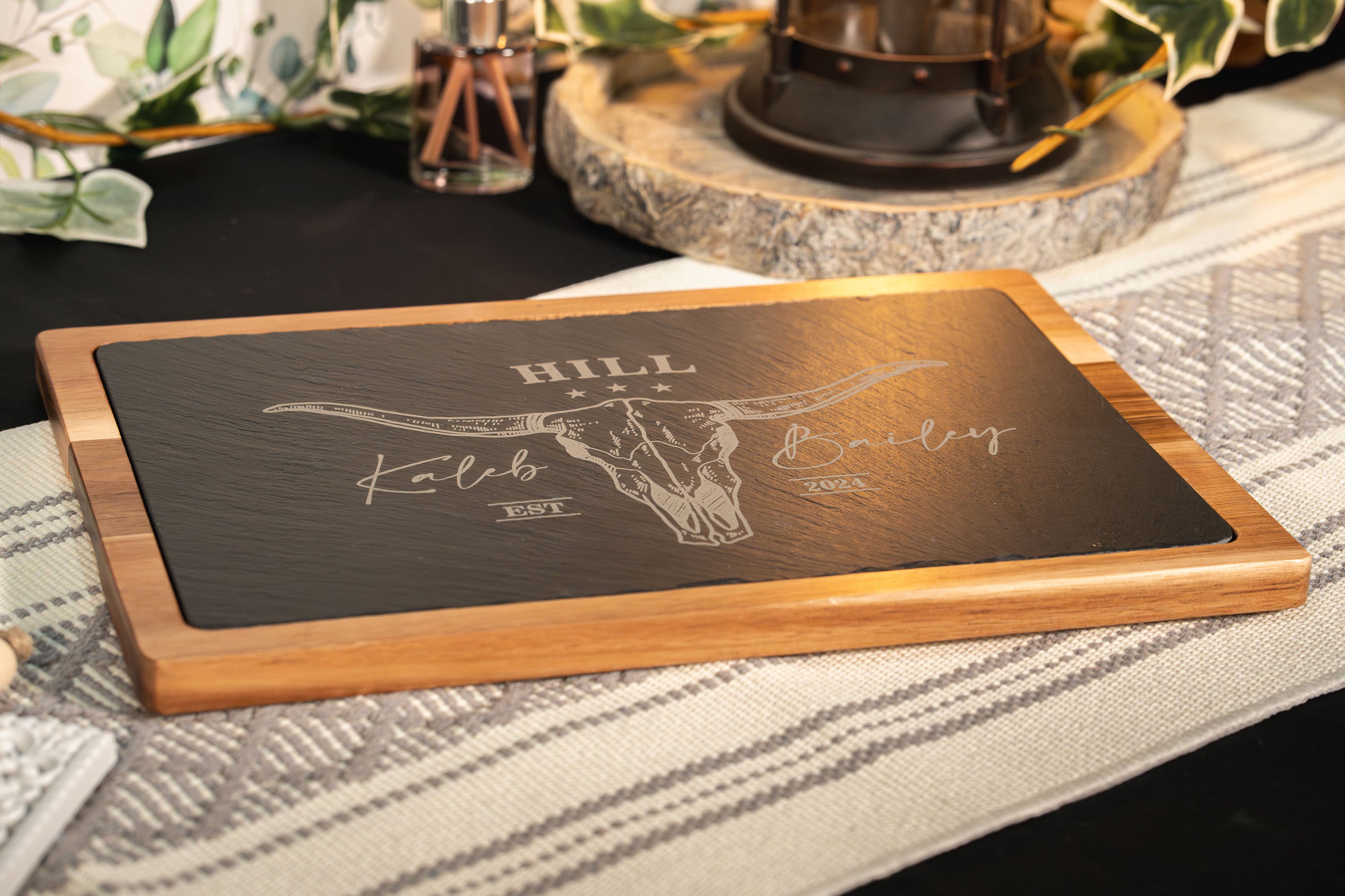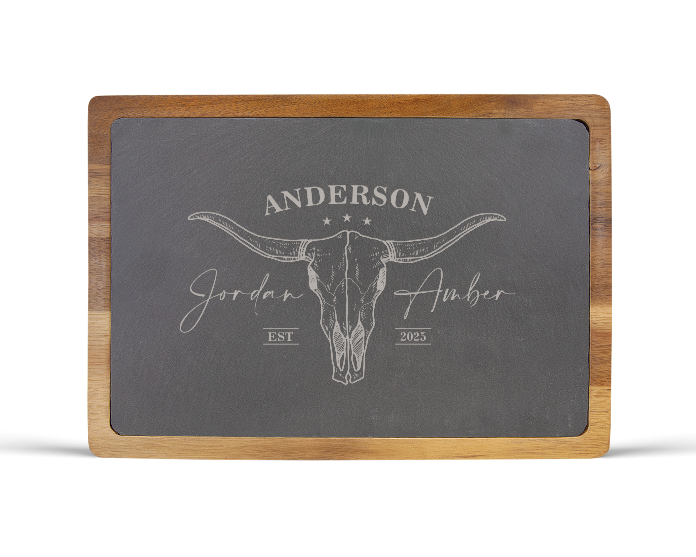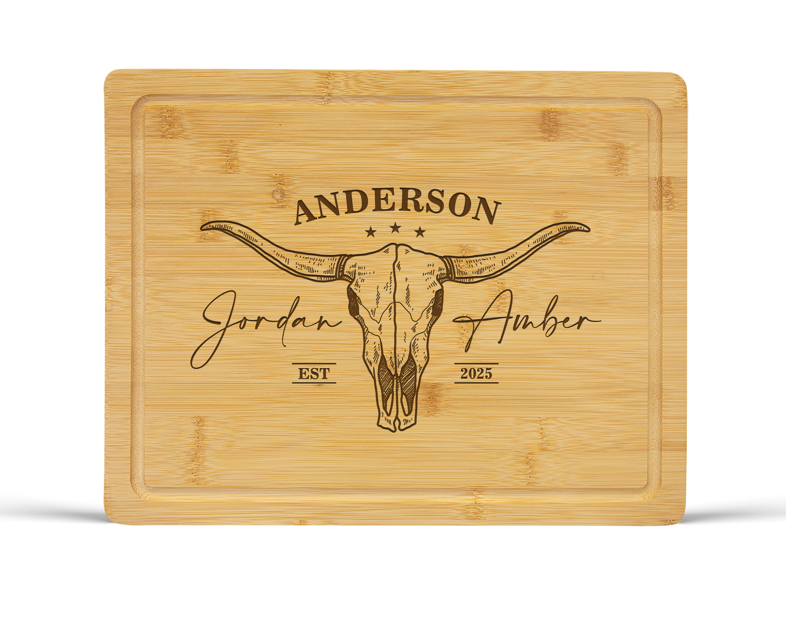 UNIQUE WEDDING AND ENGAGEMENT GIFT Our personalized charcuterie and cutting boards are the perfect gifts for weddings, bridal showers, engagements, or anniversaries. Engraved with a hand-drawn longhorn cow skull and customized with the couple's names, last name, and established year, these boards add a unique western flair to any home. Ideal for cowboy-themed celebrations or southwest weddings, they fit perfectly into country western home décor or farmhouse kitchen décor.