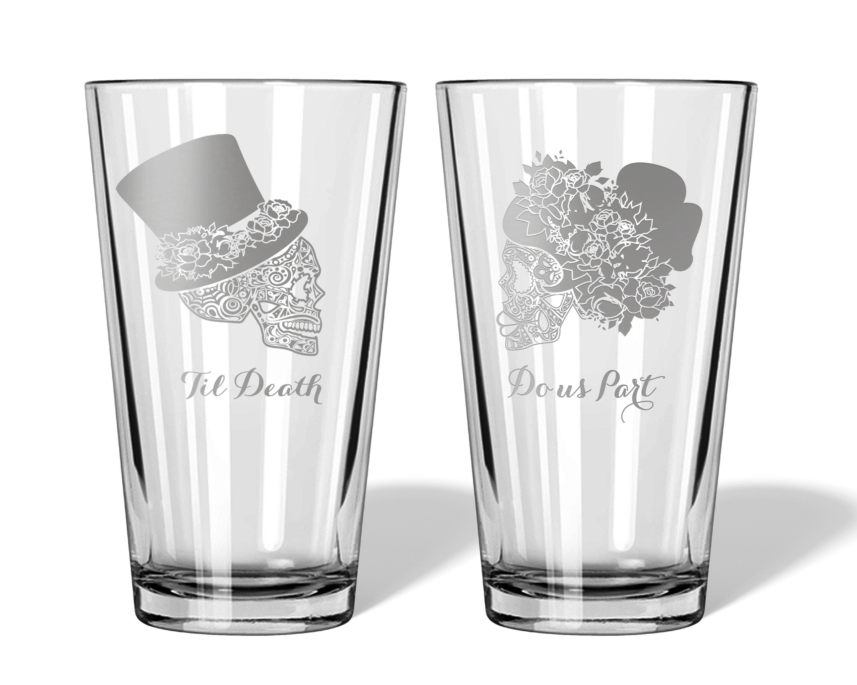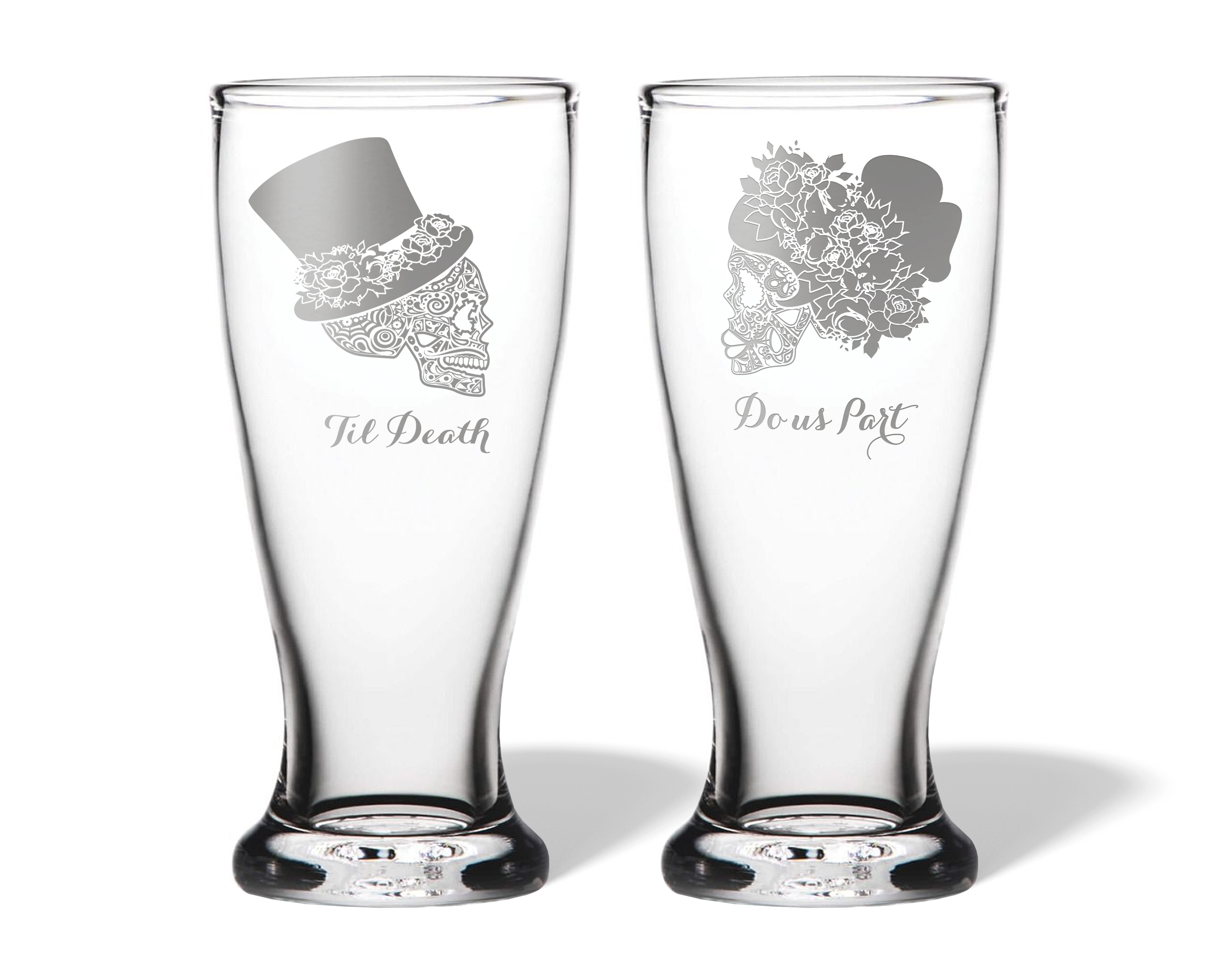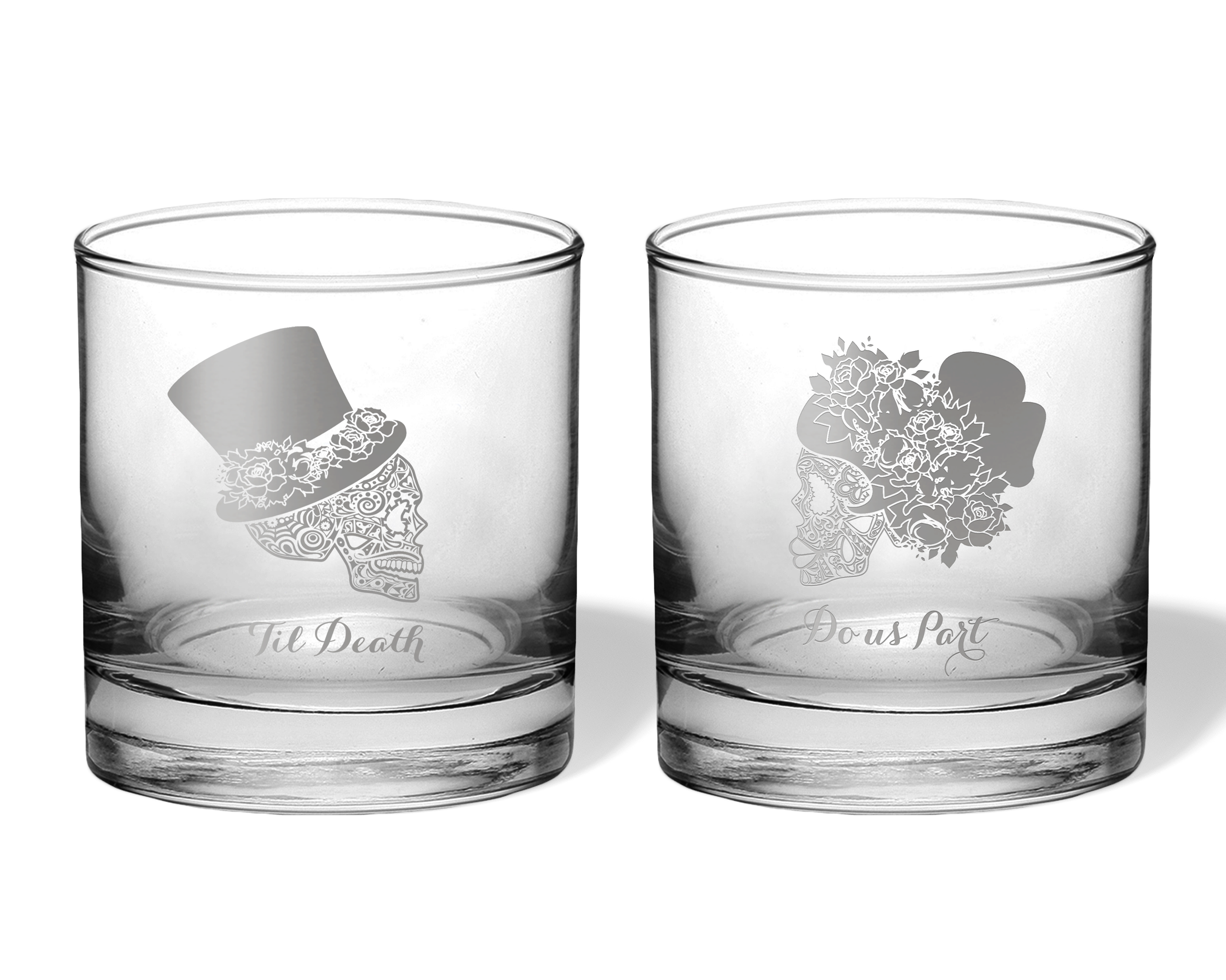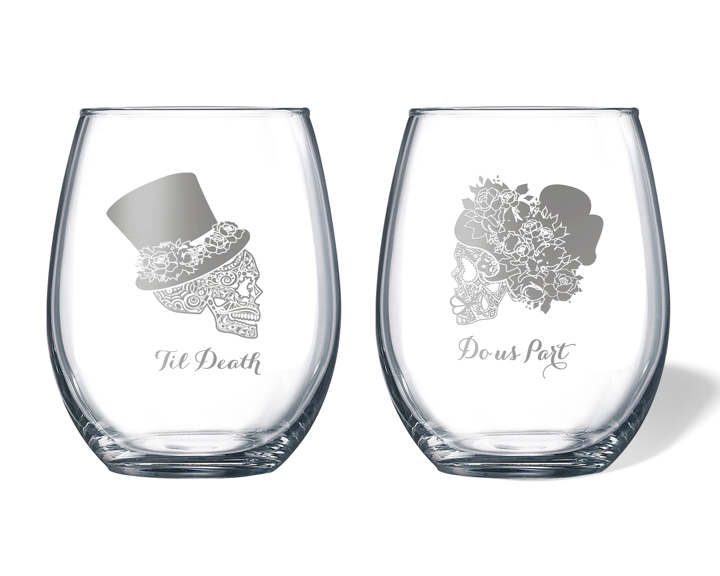 Our personalized Til Death Do Us Part Sugar Skull Bride and Groom engraved glassware set is perfect for fall or Halloween wedding decor or as a bridal shower, engagement, wedding, or anniversary gift for the couple.