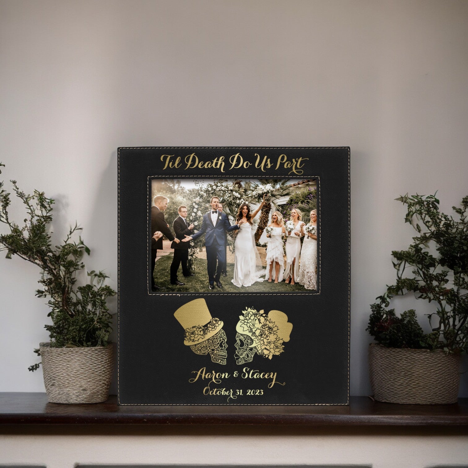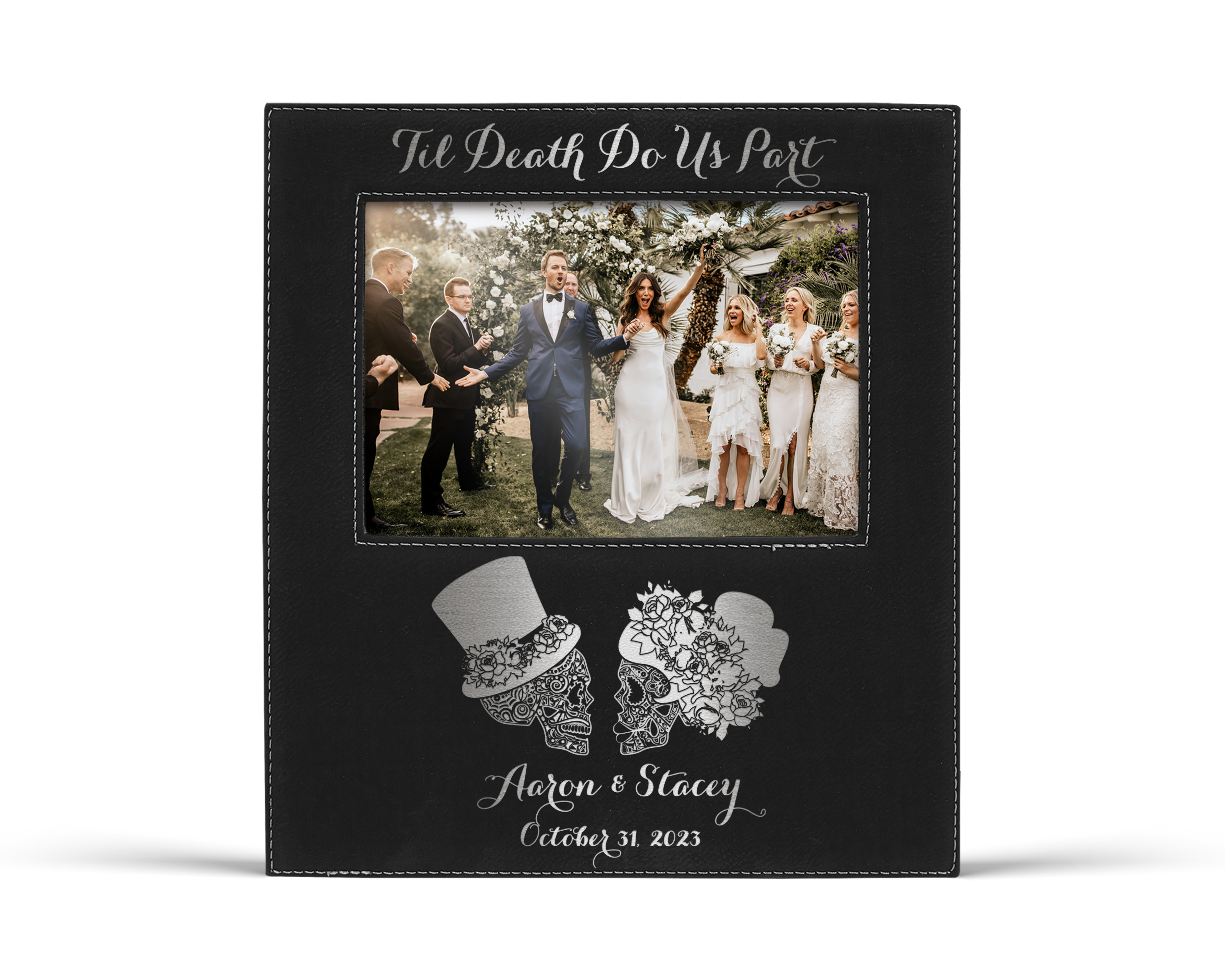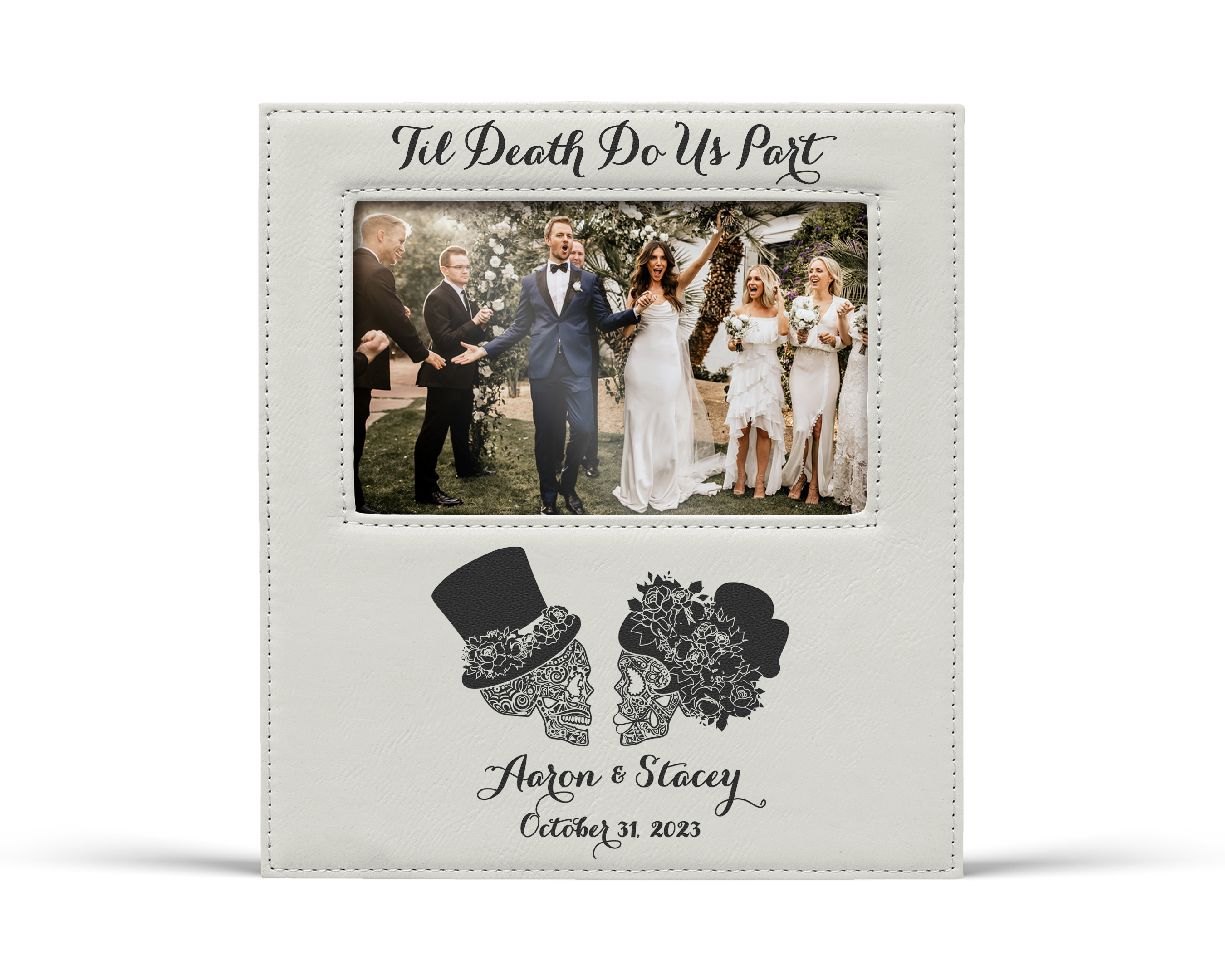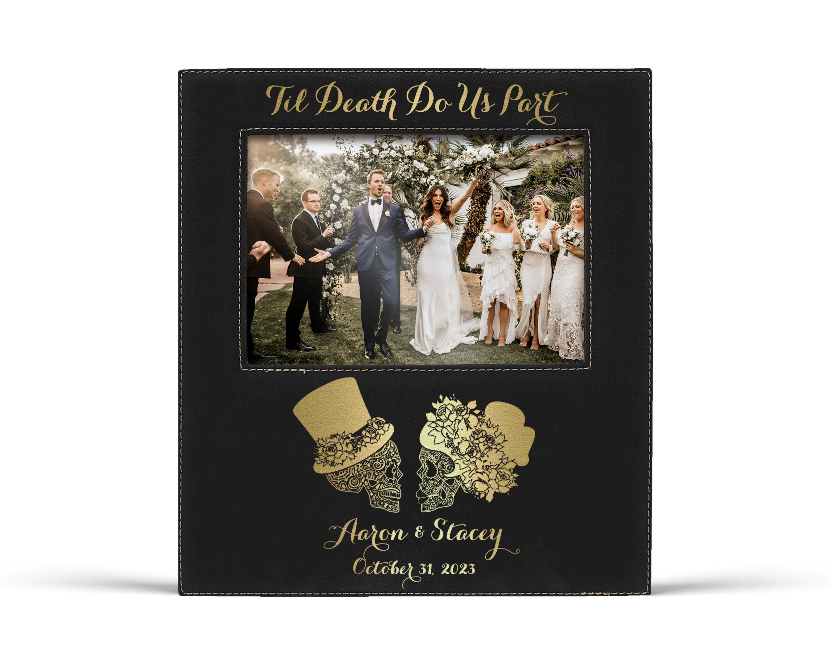 A DISTINCTIVE WEDDING GIFT Celebrate a couple’s everlasting love with our Til Death Do Us Part Wedding Picture Frame. Featuring an exclusive hand-drawn sugar skull skeleton bride and groom design, this frame is customized with the couple’s names and special date. Perfect for fall weddings, Halloween-themed celebrations, or gothic romance, this frame is an unforgettable gift that honors their eternal commitment.
