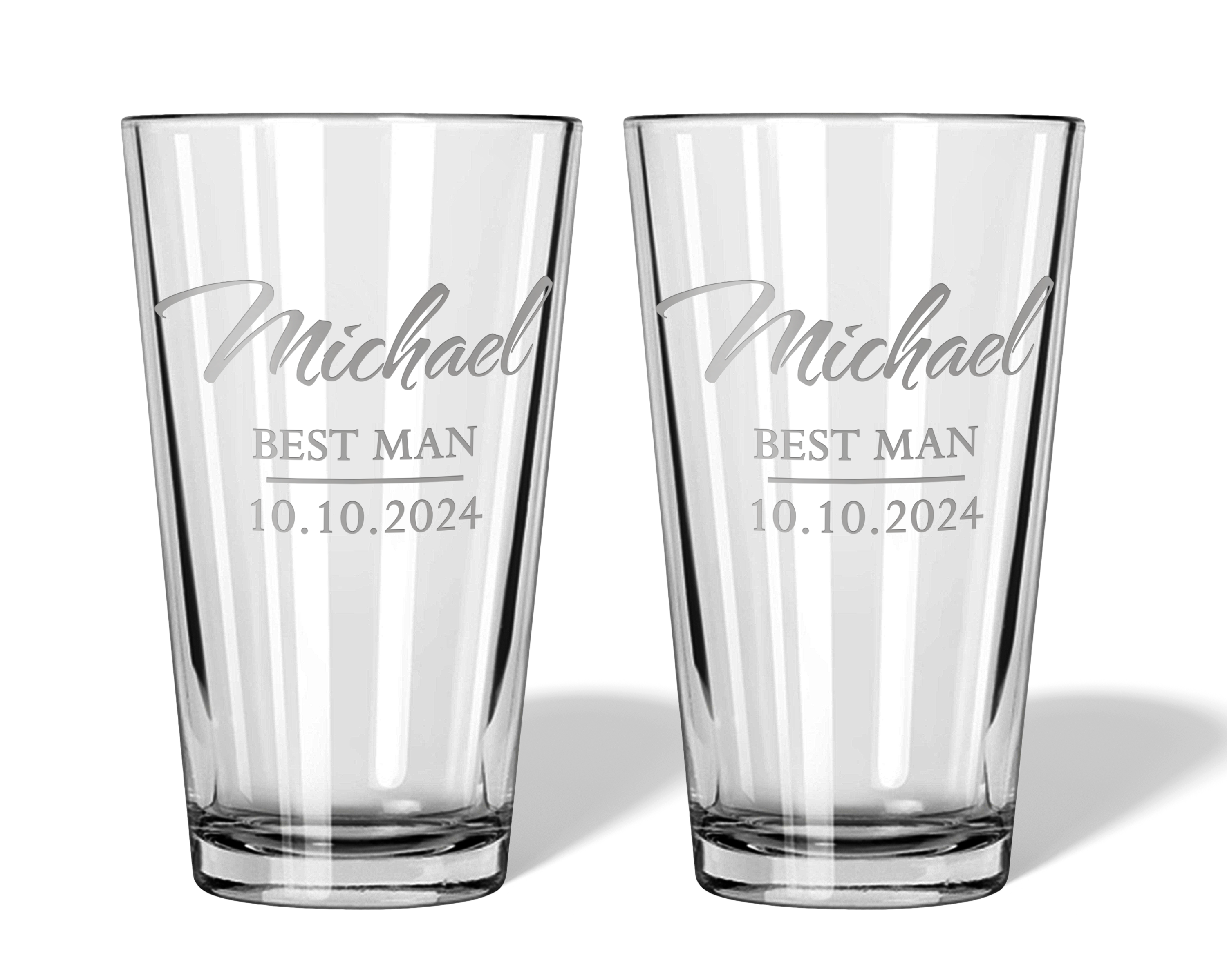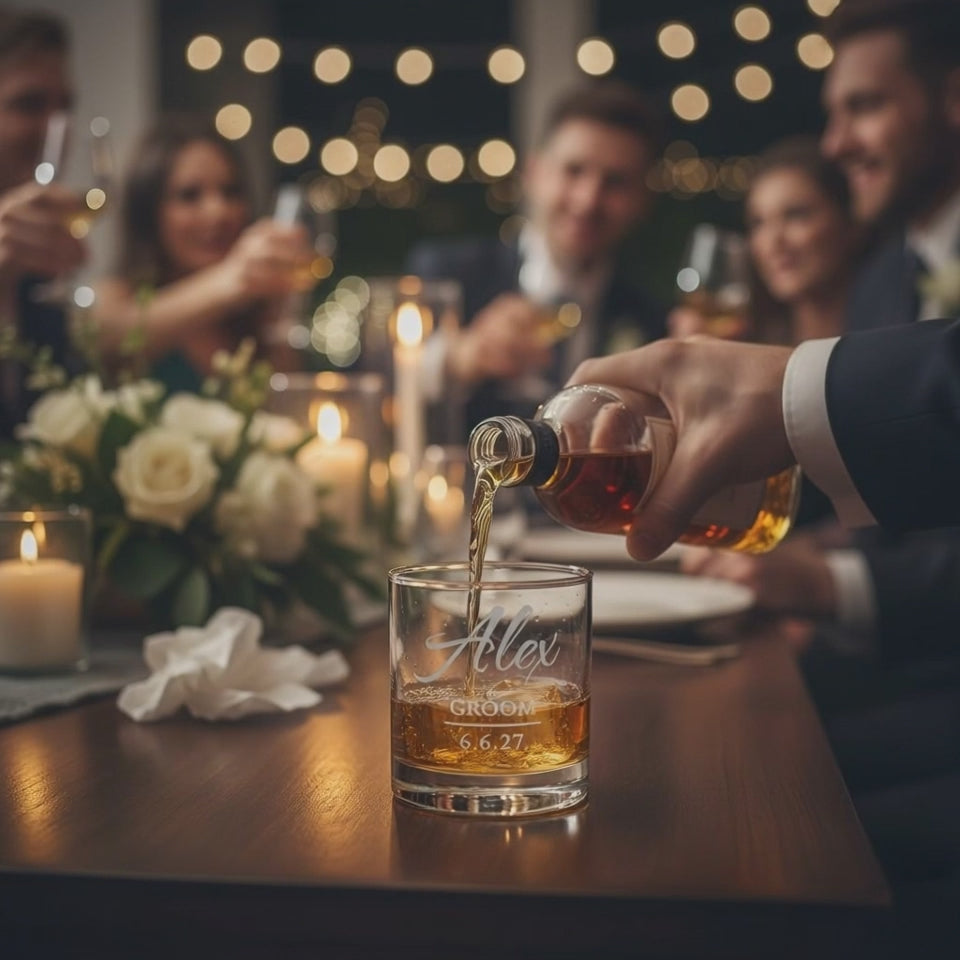 CELEBRATE IN STYLE Show your appreciation for your Best Man, Groomsman, Ushers, Officiant, and Father of the Groom with our customized engraved barware. Available as a whiskey glass or pint glass, each piece is personalized with the recipient's name, title, and the wedding date. This thoughtful and memorable gift will make your special day even more unforgettable.