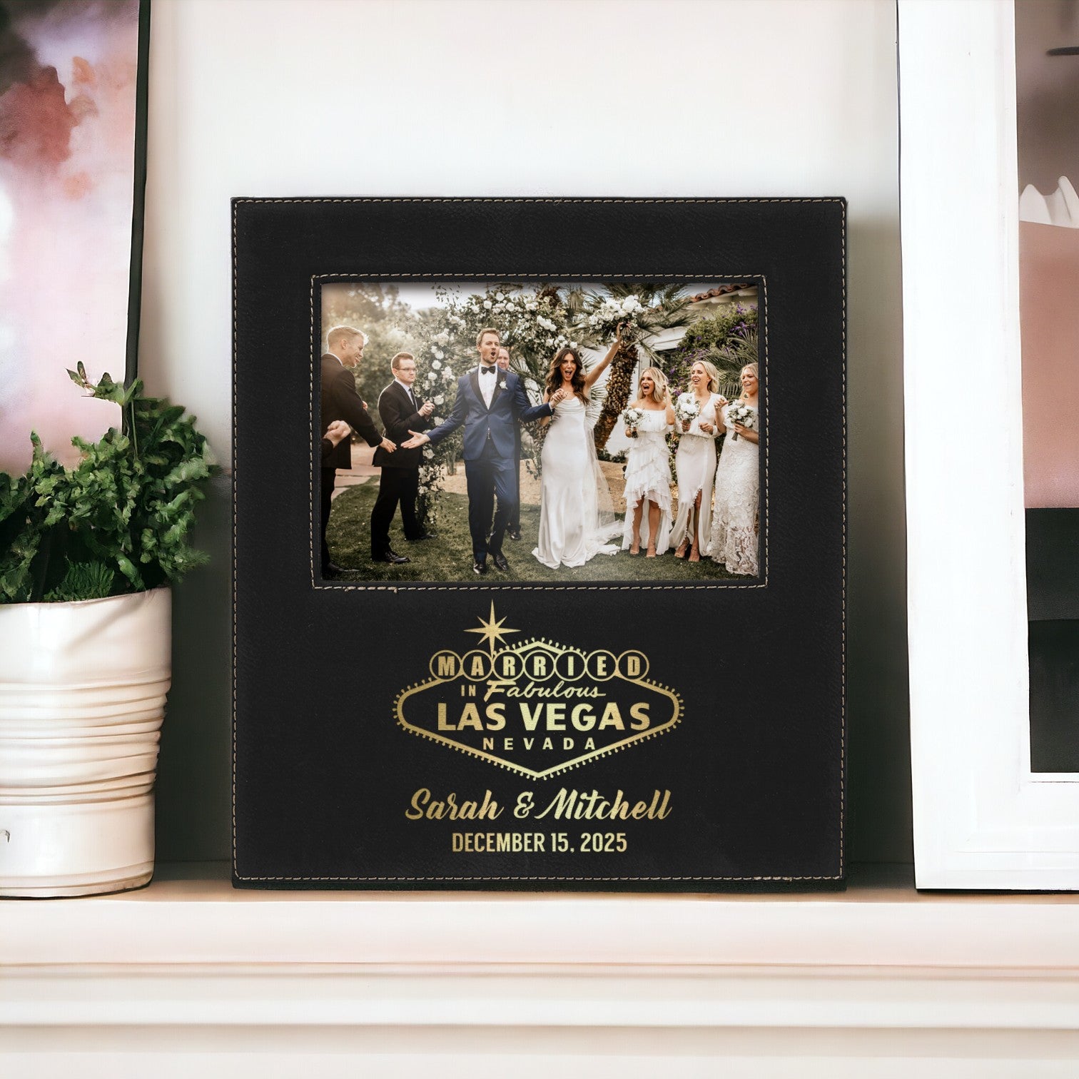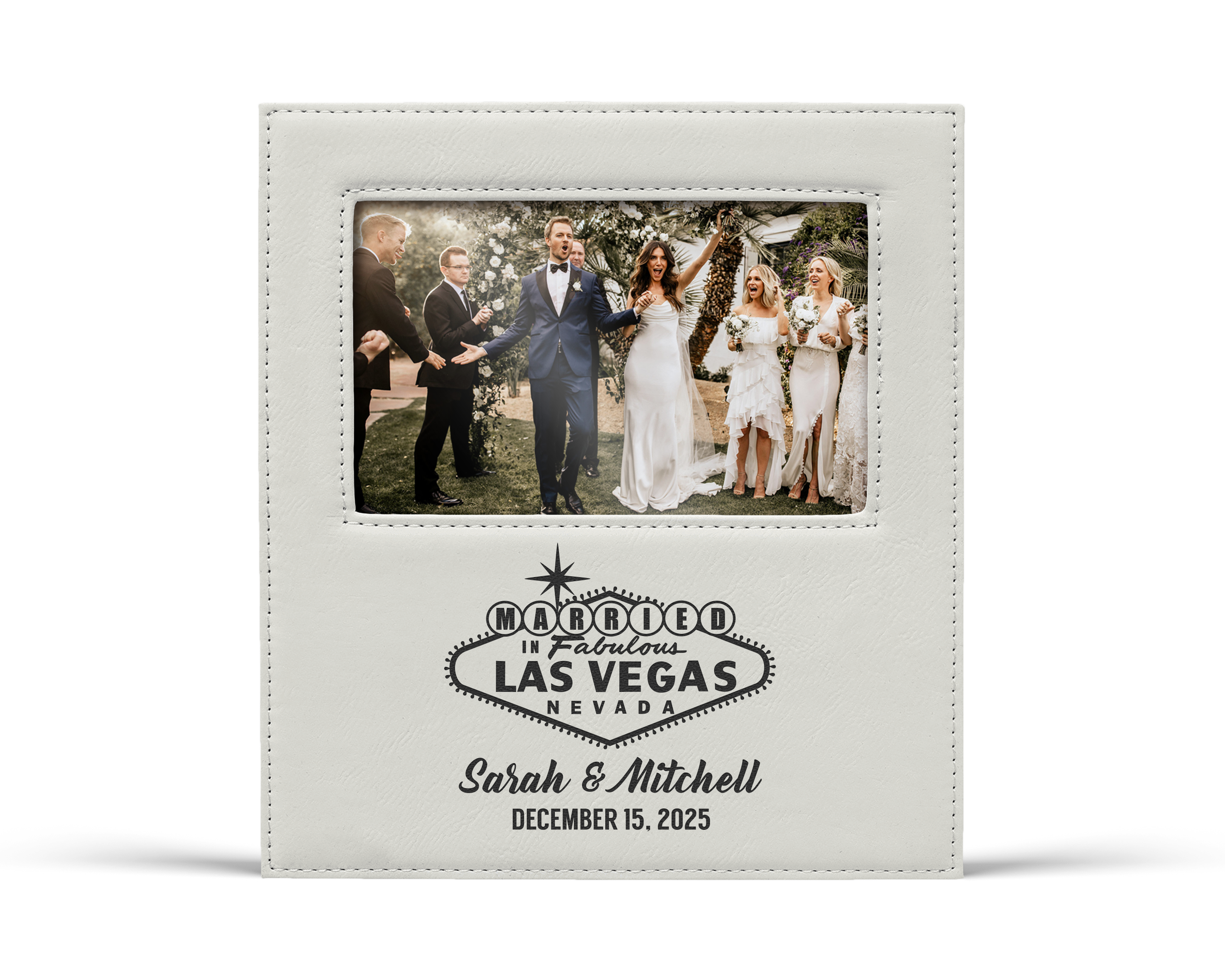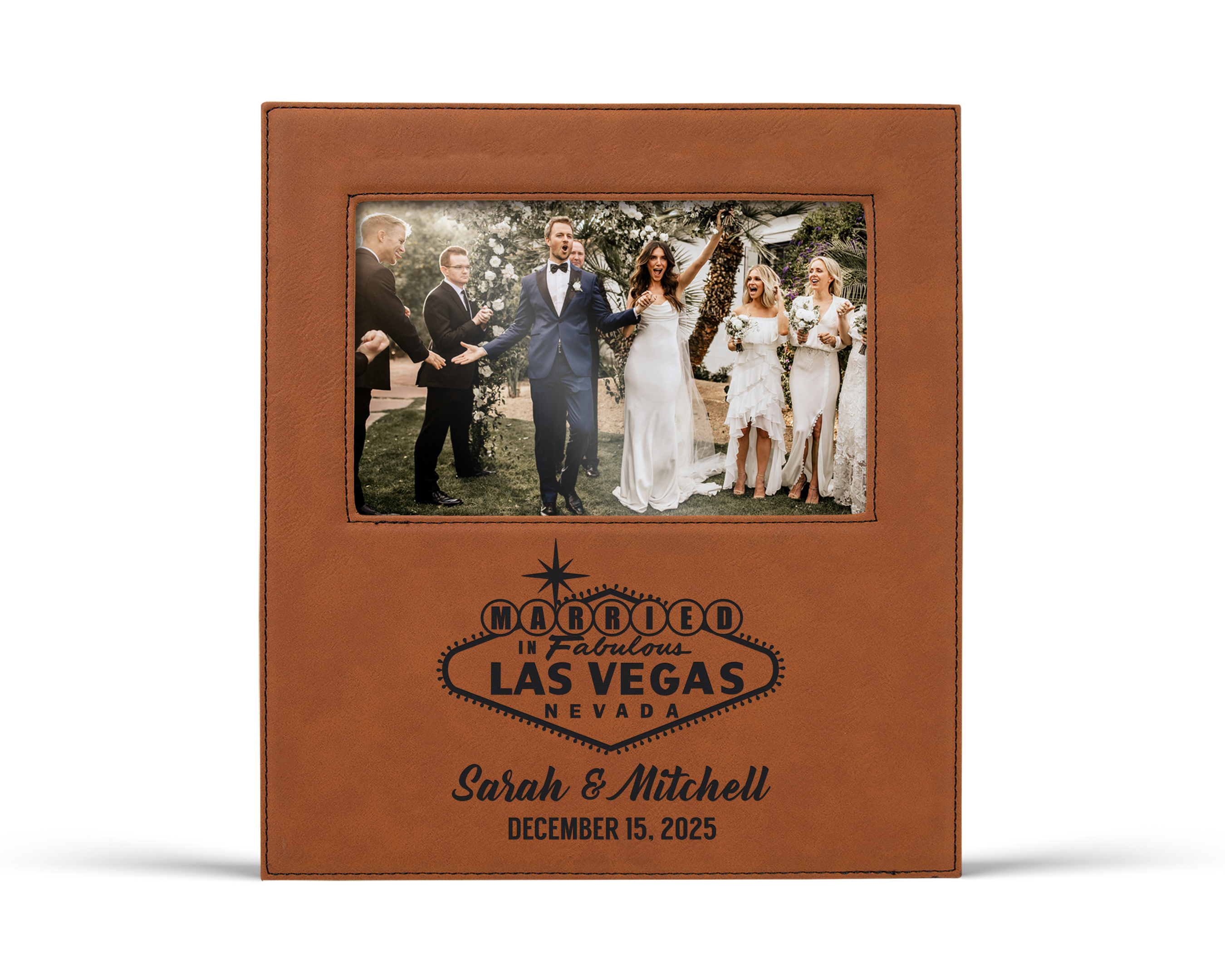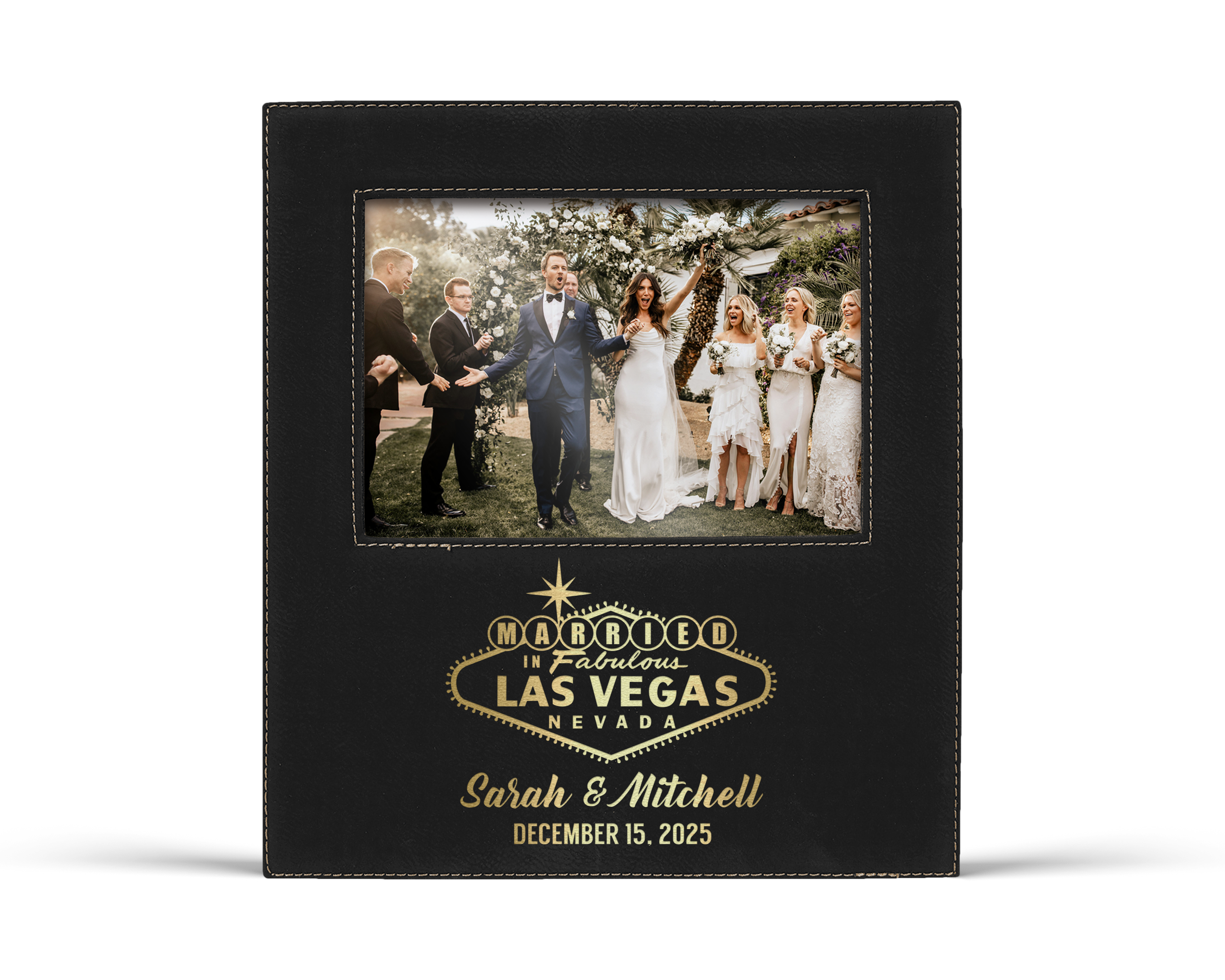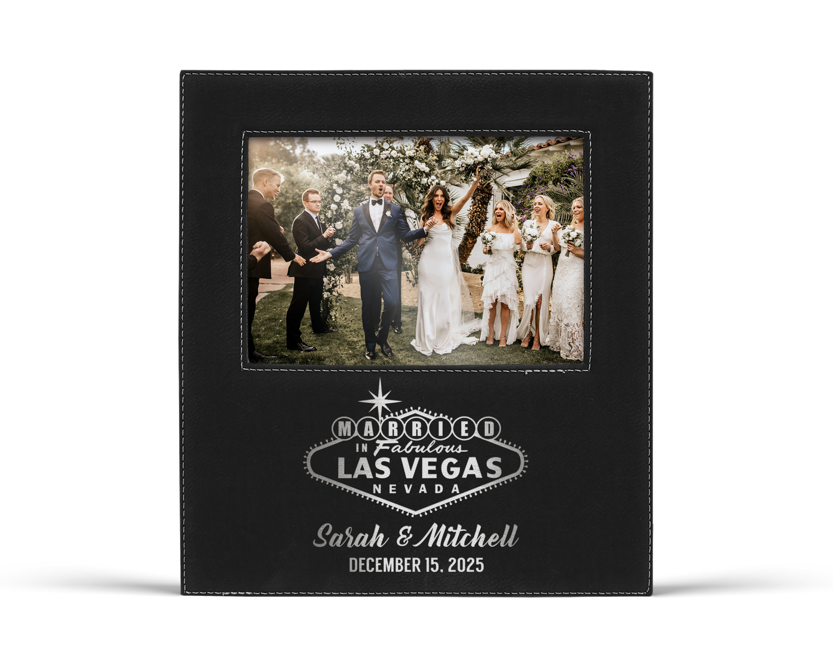 Each frame is made from vegan leather and engraved with our classic married in fabulous las vegas sign design personalized with the couple’s names and special date. It is a thoughtful and unforgettable gift that showcases their fun loving party spirit and their commitment to each other.