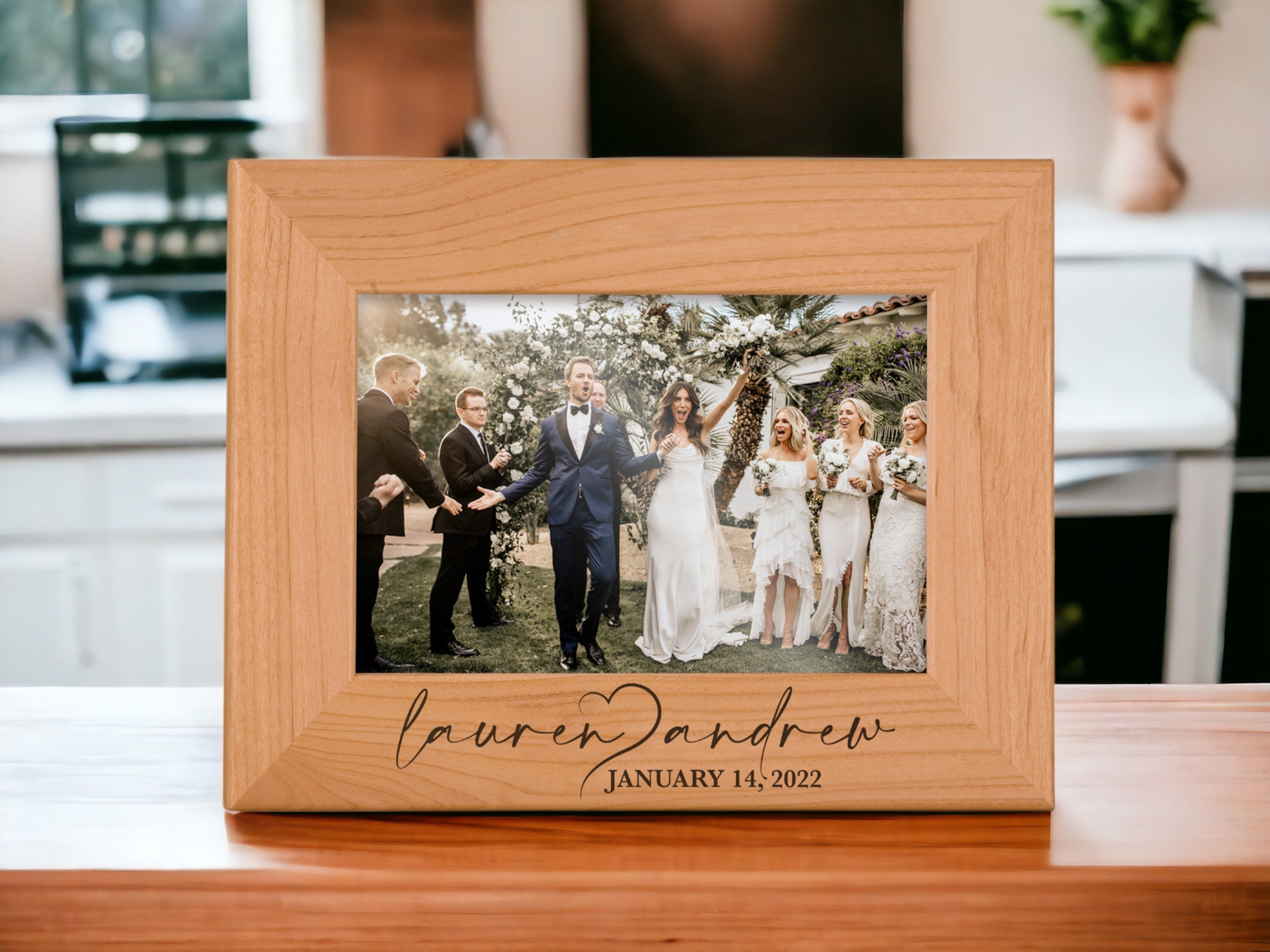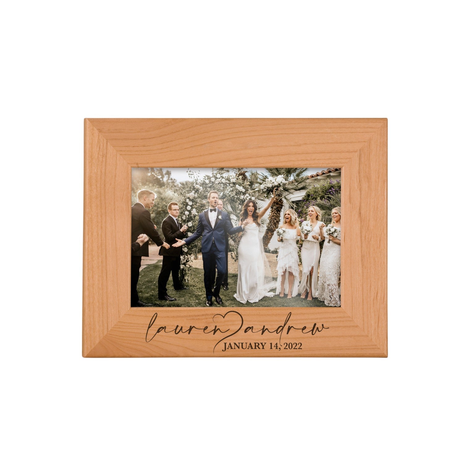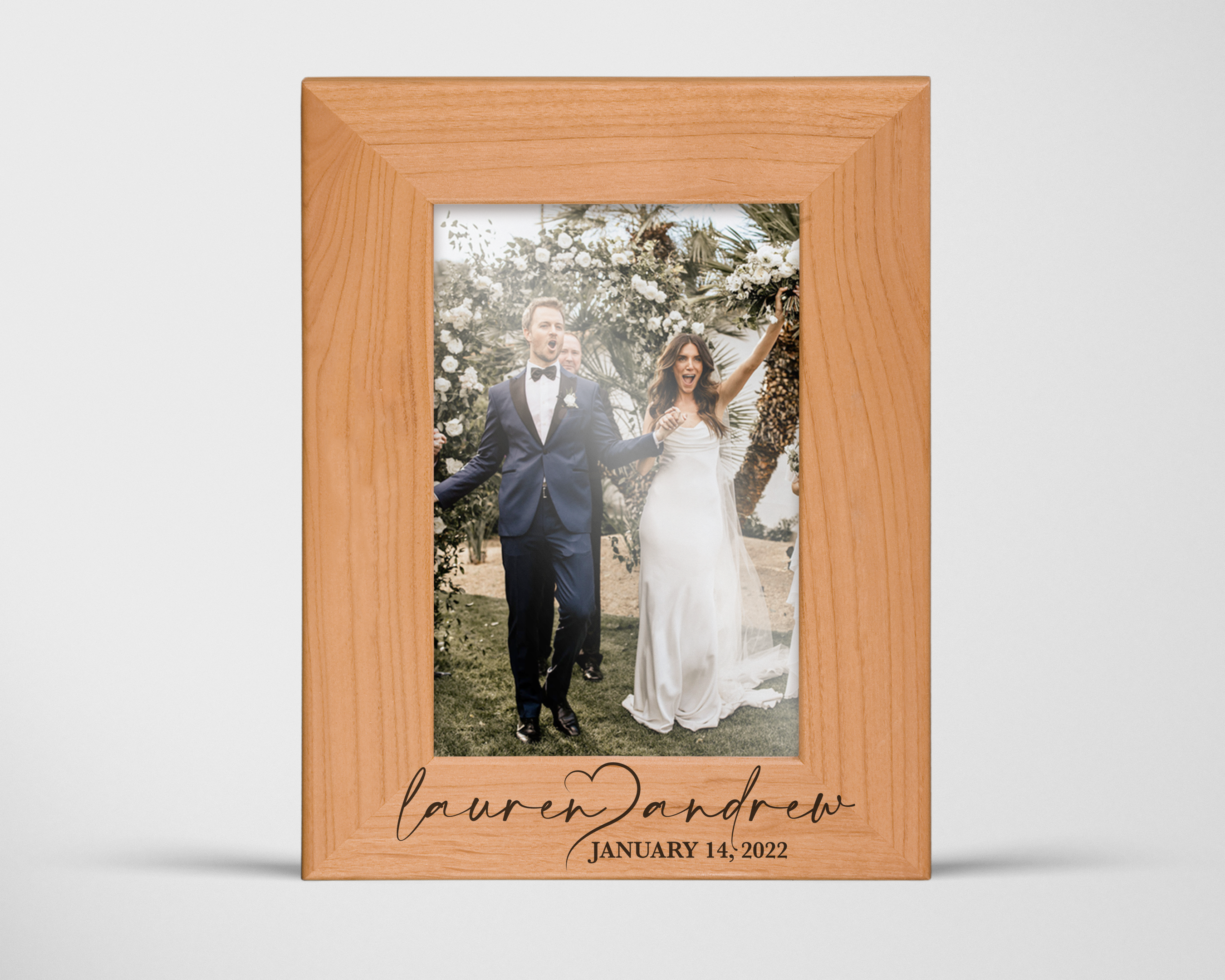 This wood picture frame celebrates a meaningful moment shared between two people. Engraved with the couple’s names separated by an open heart and finished with their special date, it’s a simple and timeless way to honor love in any season.