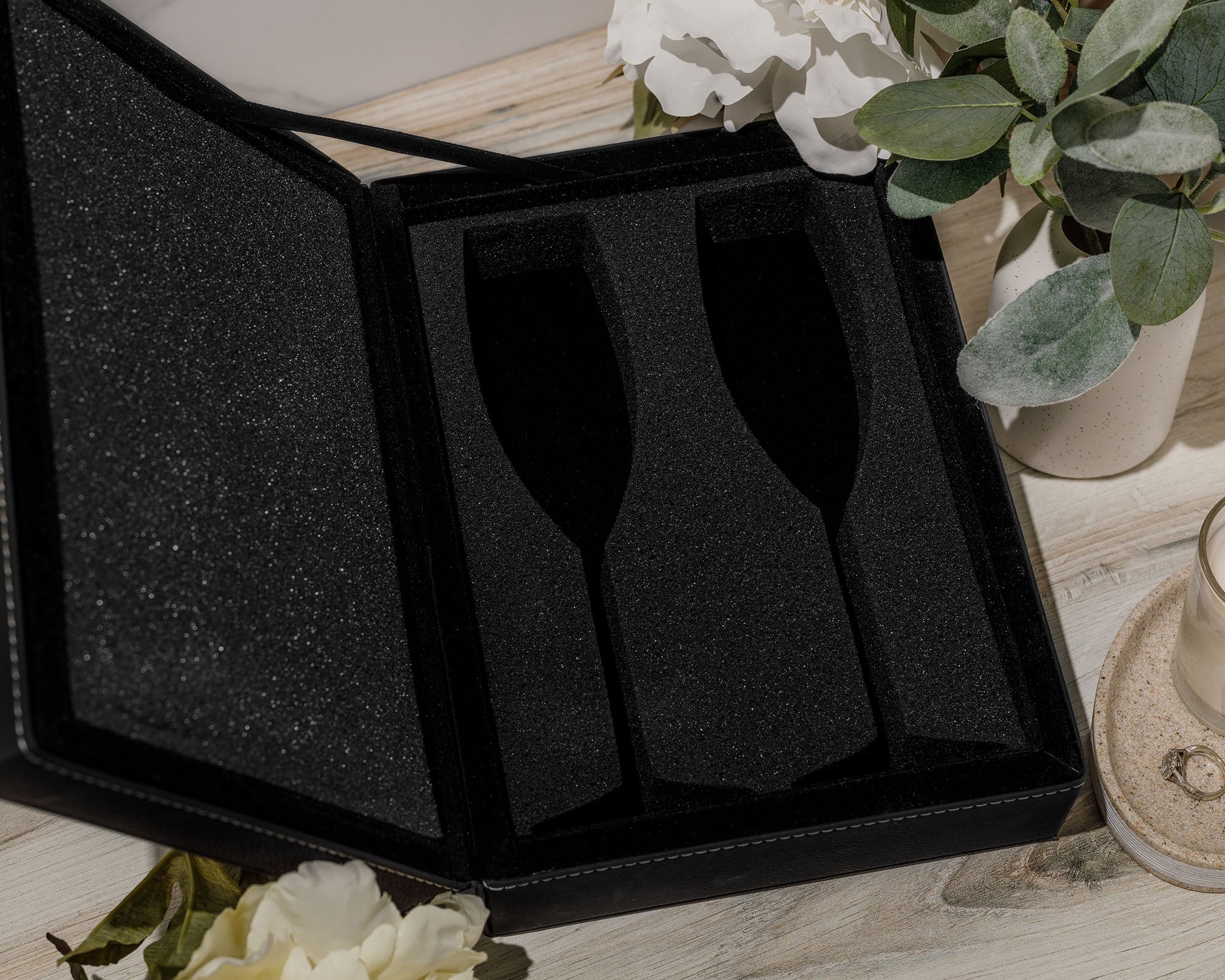 Upgrade to a Luxury Keepsake Box – Protect your flutes in a sleek black leather storage box with custom foam inserts for a gorgeous presentation that will keep these flutes looking flawless year after year.