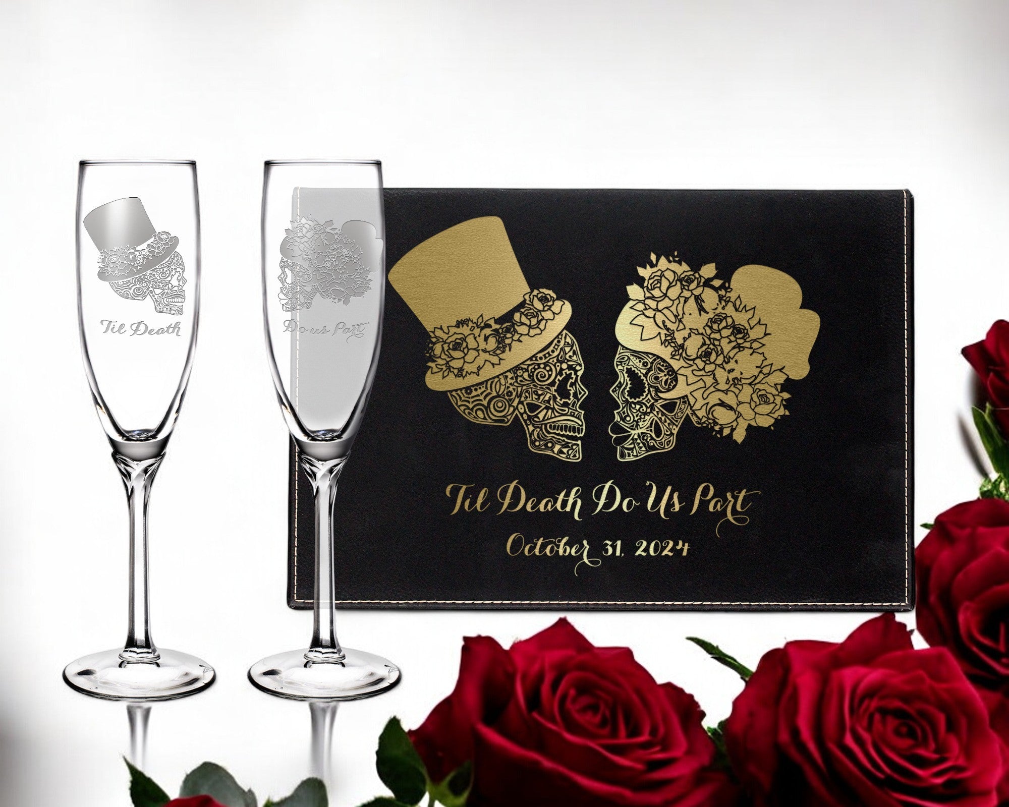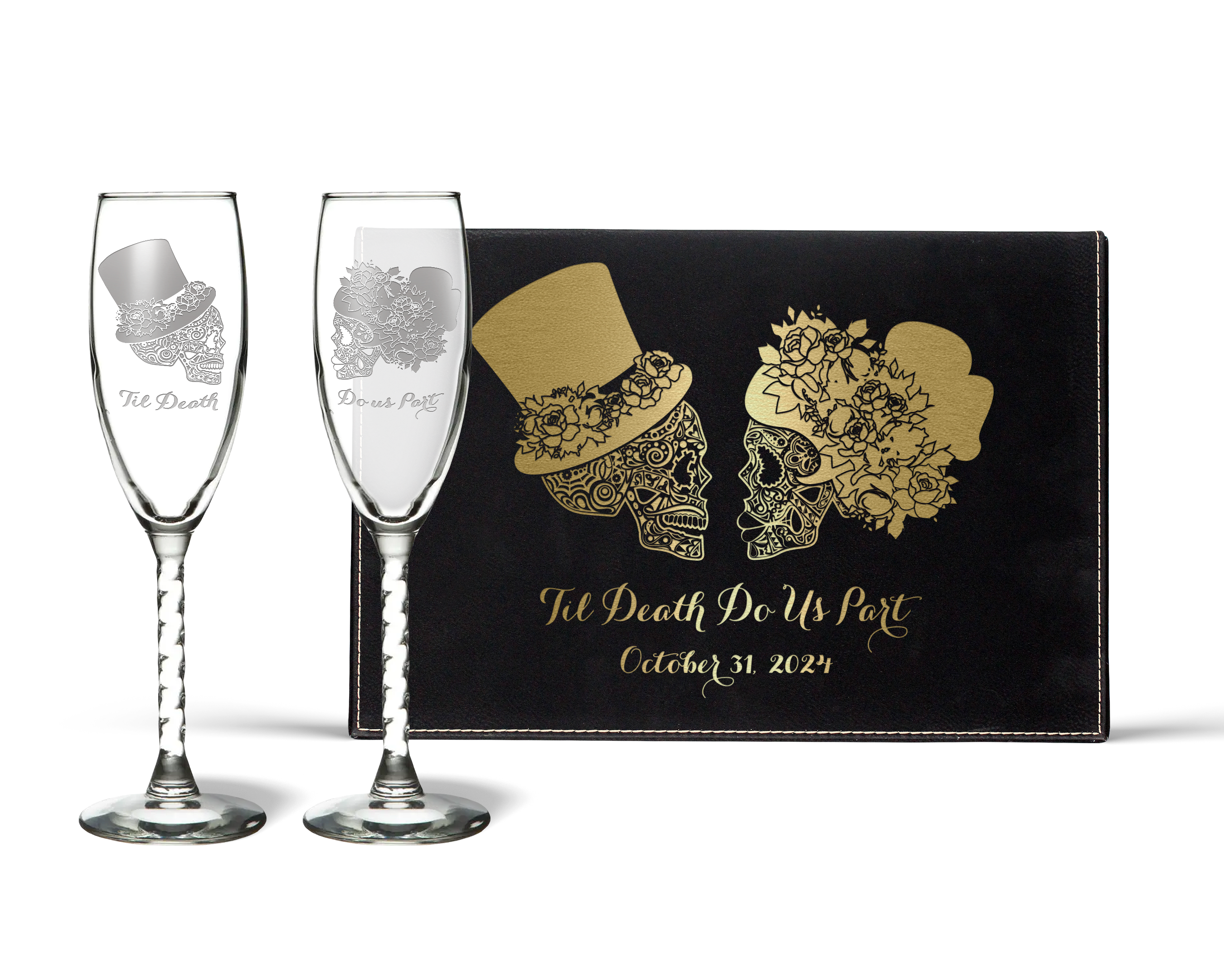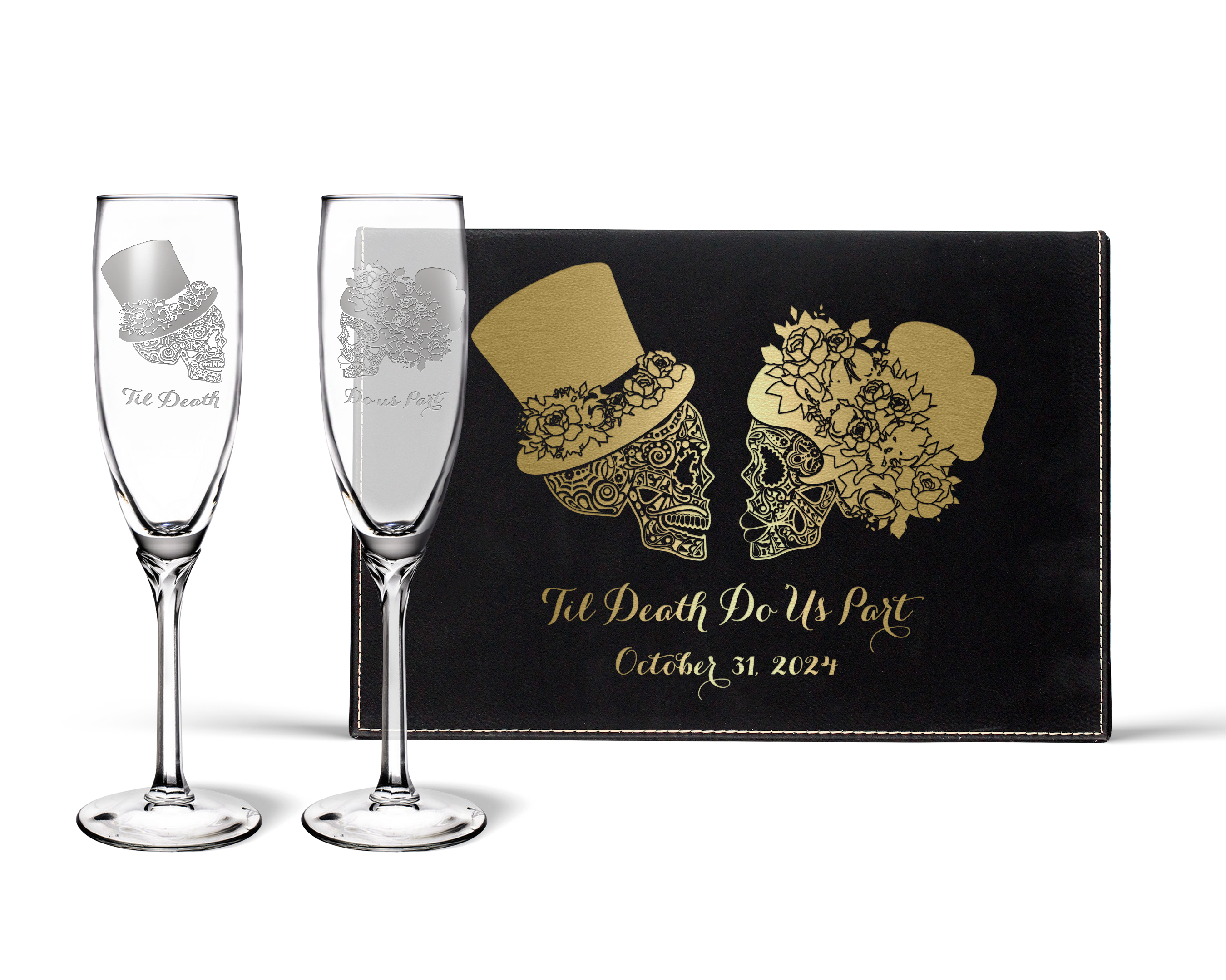 Make your wedding toast unforgettable with our Sugar Skull Champagne Flutes, the perfect blend of elegance and edgy romance. Designed for Halloween and fall weddings, these flutes are engraved with the couple’s names and wedding date, creating a one-of-a-kind keepsake to cherish forever.