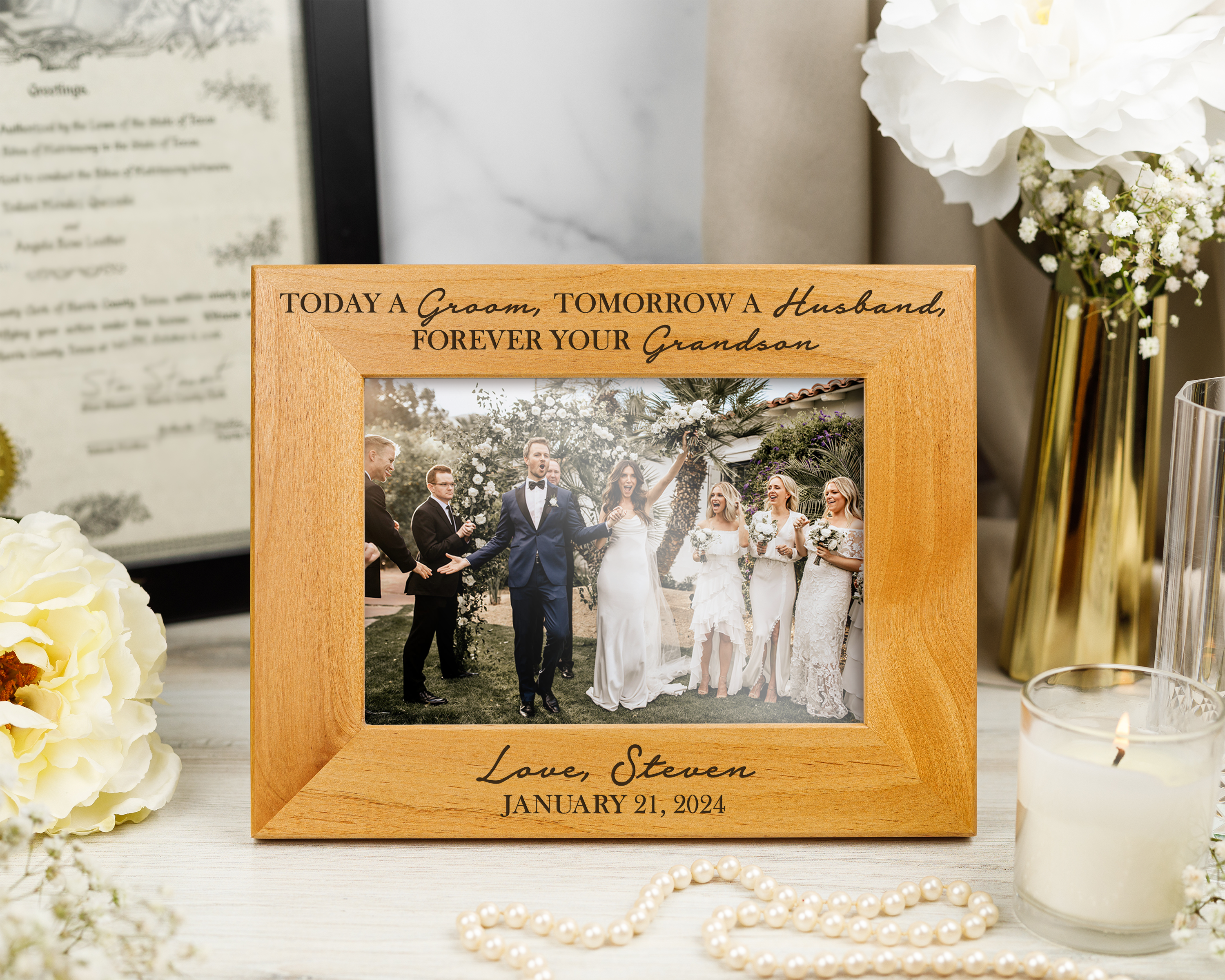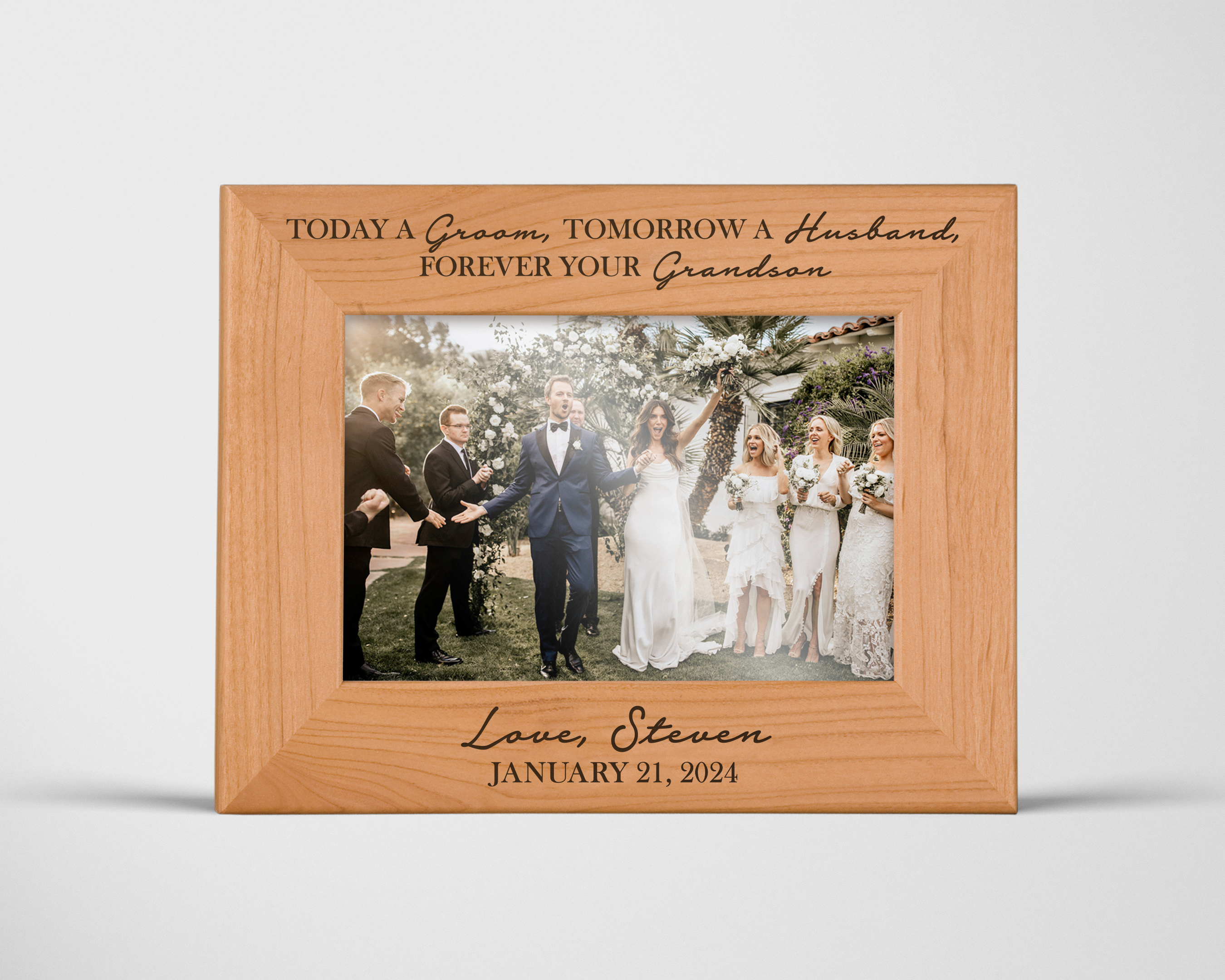 A HEARTFELT GIFT FOR GRANDPARENTS Celebrate a special wedding day with our personalized red alder picture frame, designed to honor the Grandparents of the Bride. Engraved with the bride's name, wedding date, and a cherished message, this elegant frame is a touching keepsake that will be treasured for years to come.