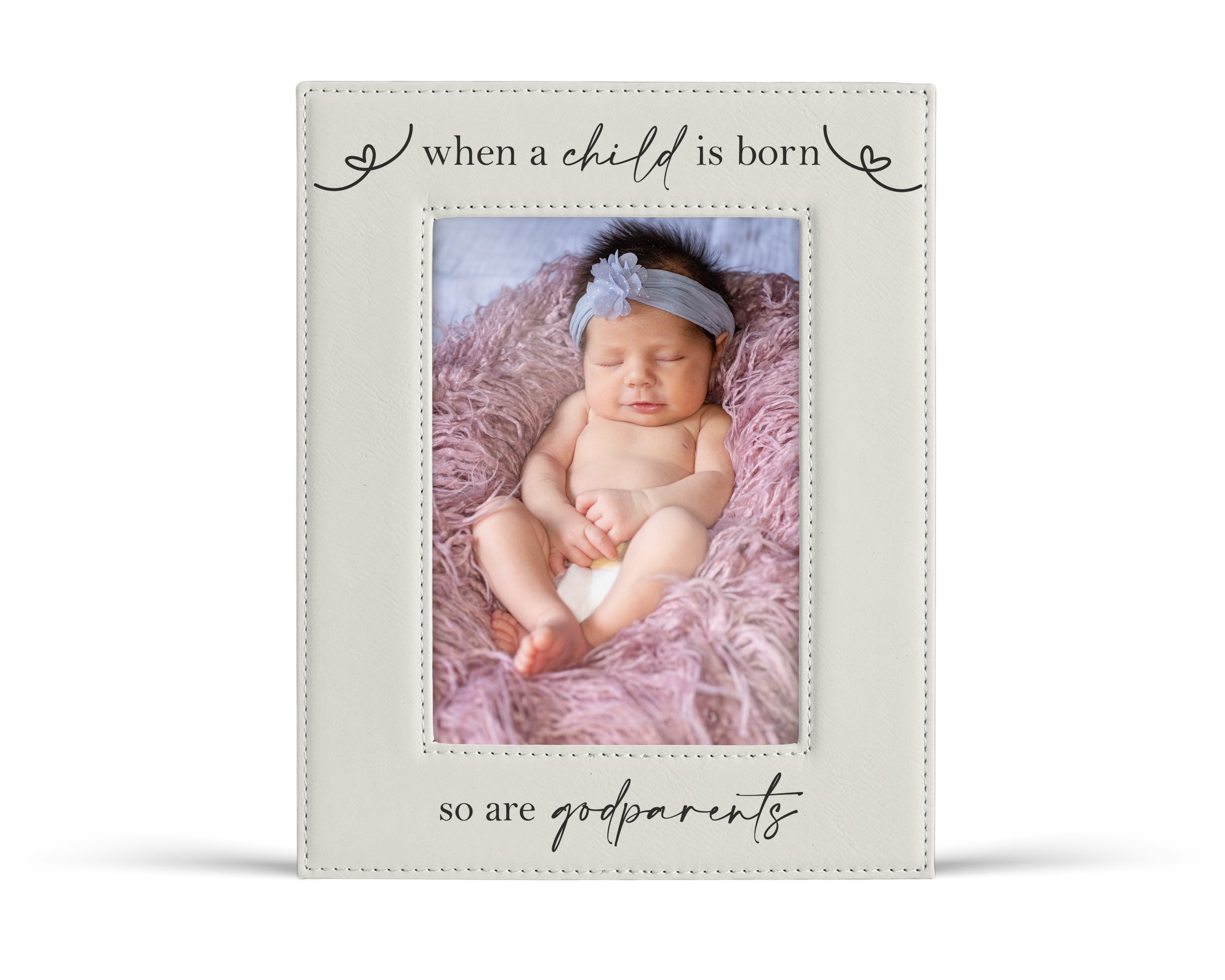 The phrase “when a child is born so are godparents” is engraved across the top and bottom of the frame, with the option to personalize the bottom right corner with the child’s name or birth year. Clean, understated, and gently faith-forward, this frame is a meaningful choice for a godparent proposal, baptism or christening keepsake, baby dedication, or a heartfelt thank you.