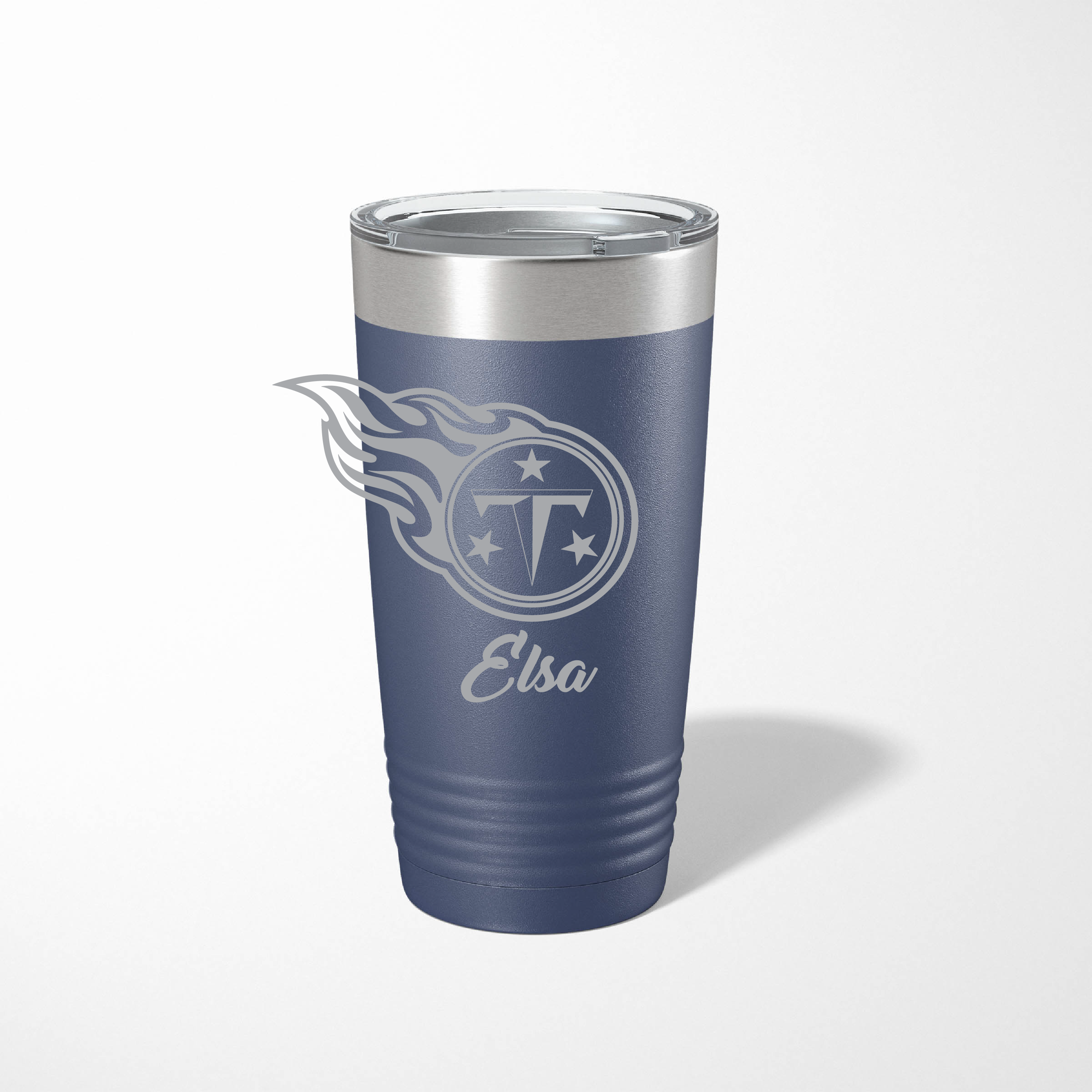20oz Navy Blue Tumbler engraved with Titans logo and personalized with name.